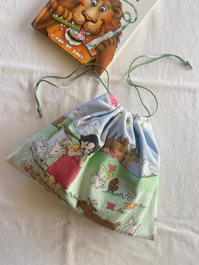 フランスのヴィンテージファブリックで製作した巾着になります。アルプスの大自然の中で生活するハイジや動物たちが可愛く描かれています♡ 裏地は高密度で織られたコットン生地を生地を合わせました! 巾着を開けた時にパッと見えるピンク色のストライプが楽しいです。 グリーンのサテン紐はフランスパリの老舗手芸店(Ultramod)で入手いたしました!するするっと開閉できます。 バッグインバッグとしても使い勝手の良い大きさで、ちょっとしたお買い物やご近所でしたら巾着だけ持っていかれても良さそうです。カゴバッグから見えてもかわいいです♡ 長財布やメガネケース、携帯、ハンカチ、小さい巾着などがすっぽり収まるサイズ感です。 23×30cm ビンテージシーツを使用いております。 プリントのずれや色あせ等見られることもありますが、それも味と思っていただけると嬉しいです。