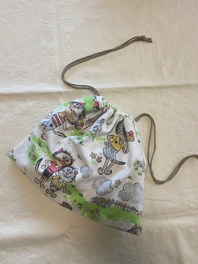 ドイツのヴィンテージファブリックで製作した巾着になります。ねずみやサル、ひよこ、くまたちが、それぞれ思い思いのアイテムを手に、楽しそうにしている様子がかわいいです。 内布は、高密度コットンの薄いギンガムチェックブルーで合わせてみました。 シルバーのサテン紐もポイントです^ ^ 長財布やメガネケース、携帯、ハンカチ、小さい巾着などがすっぽり収まるサイズ感で、バッグインバッグとしても活用していただけるかと思います。 23×30cm (1枚目の写真左側の大きい方の巾着になります。) 良い感じのシャビーなビンテージコンディションです。 ビンテージシーツを使用いております。 プリントのずれや色あせ等見られることもありますが、それも味と思っていただけると嬉しいです。