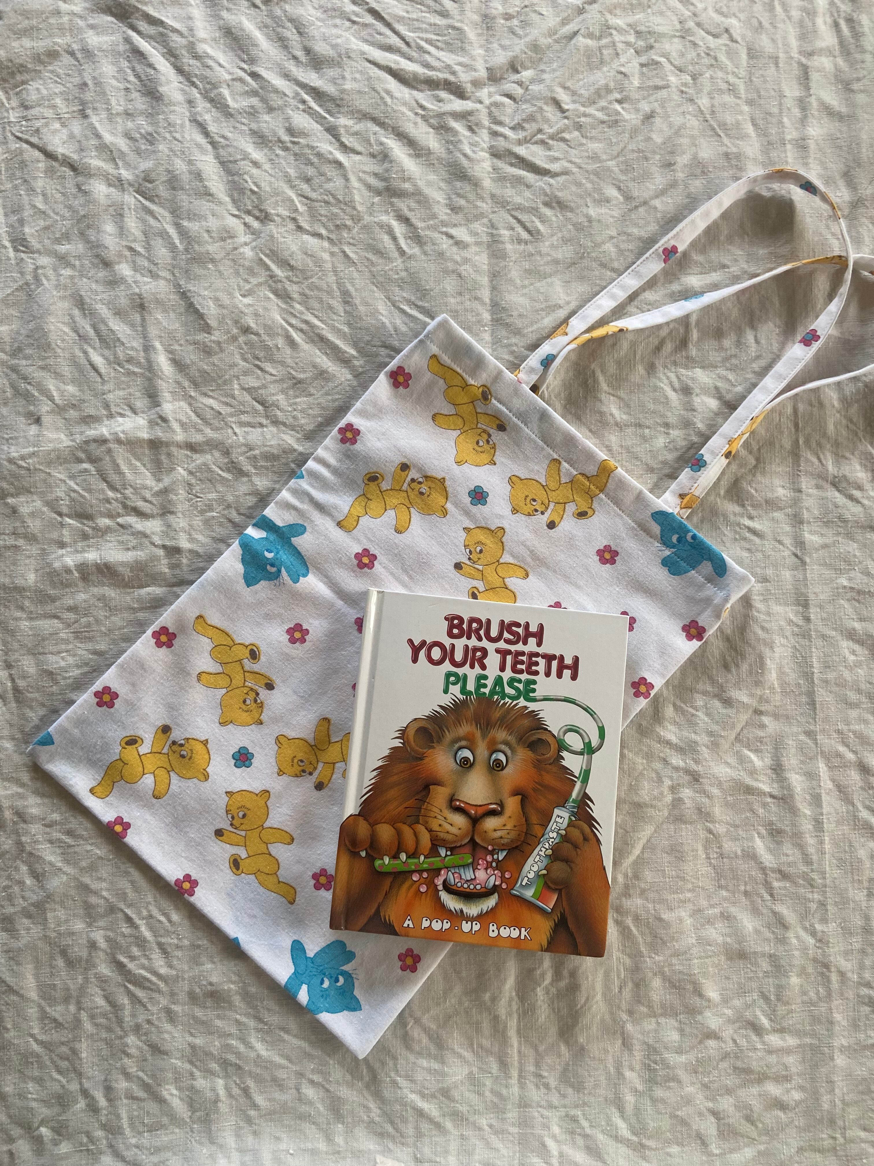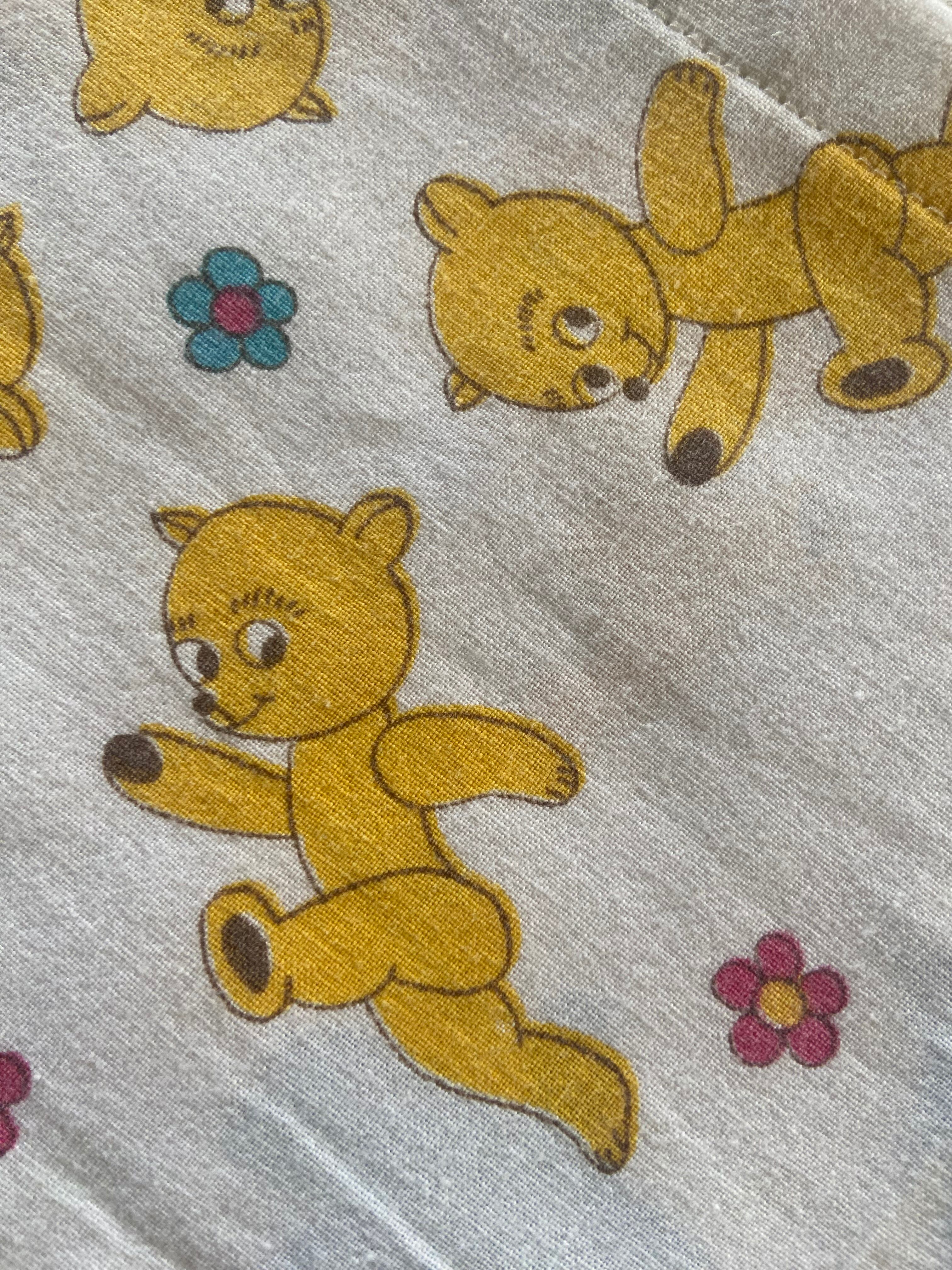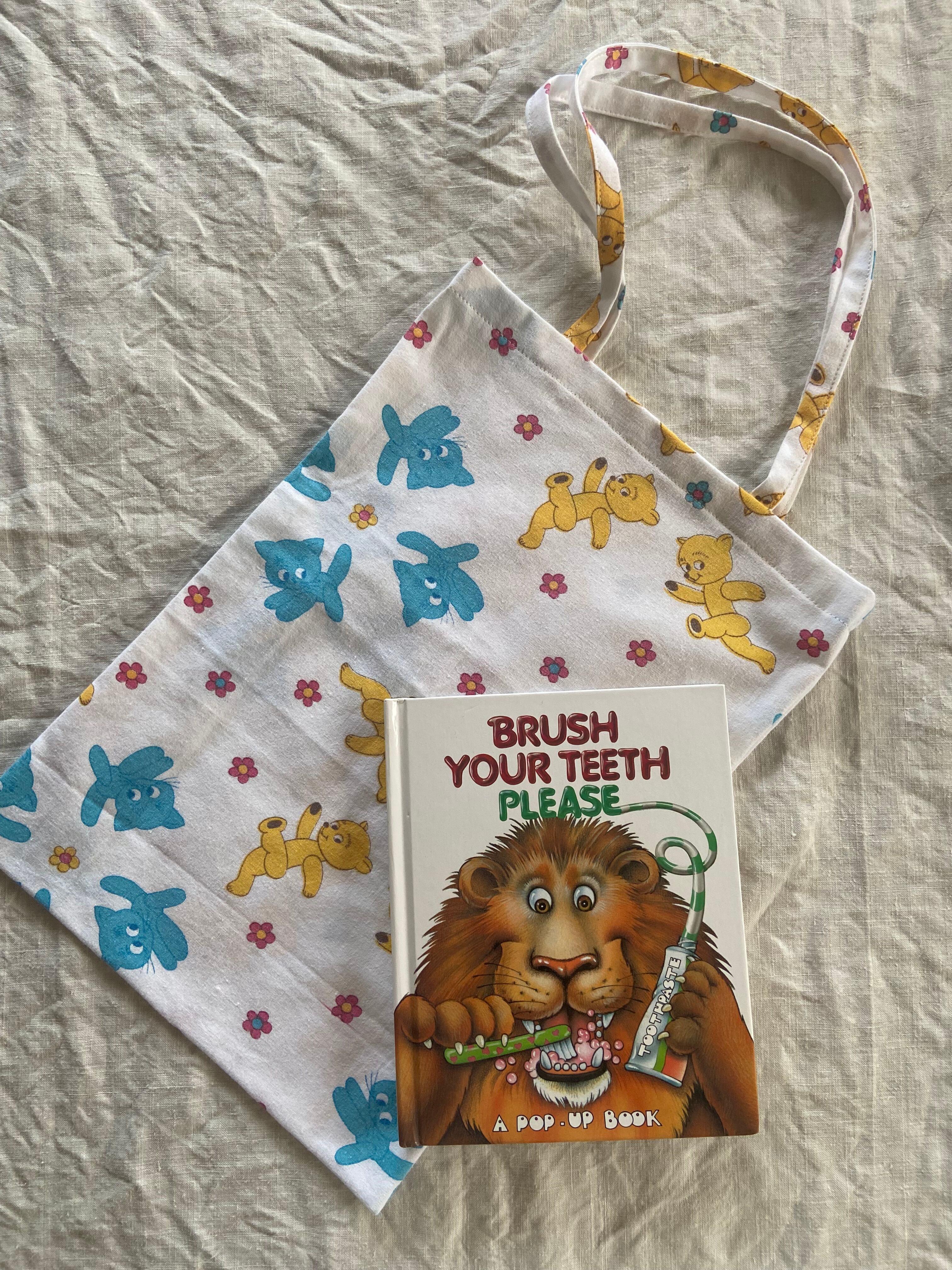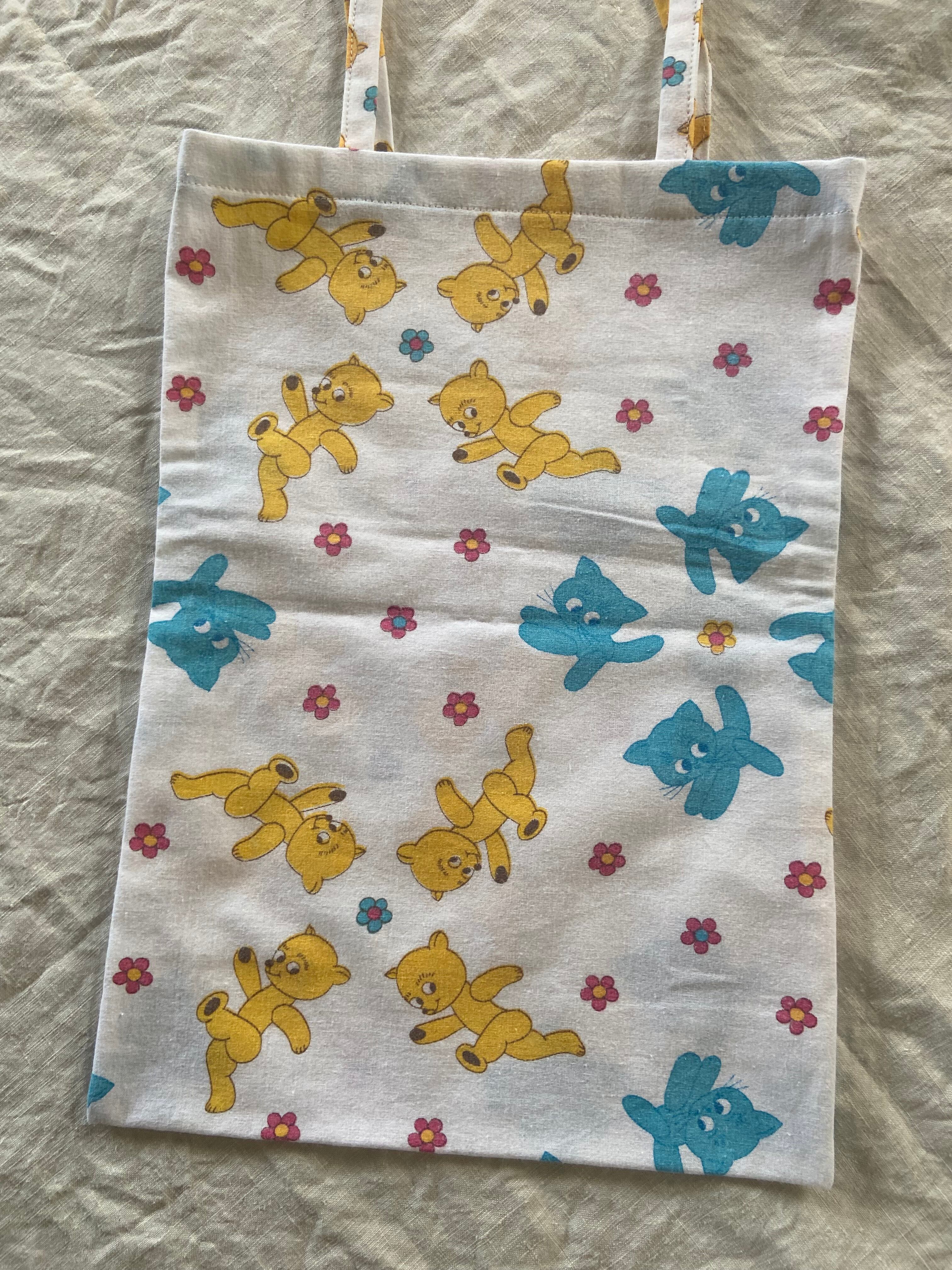 ドイツのビンテージシーツで制作したバッグになります。どこか自信満々のはりきりクマさんと弱気なネコちゃん。見ているだけでほっこりした気分になります^^