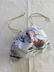 アメリカのビンテージシーツで作成したスヌーピー巾着になります。スヌーピーと仲間たちが楽しそうに遊んでいて見ているだけでハッピーになれそうです。