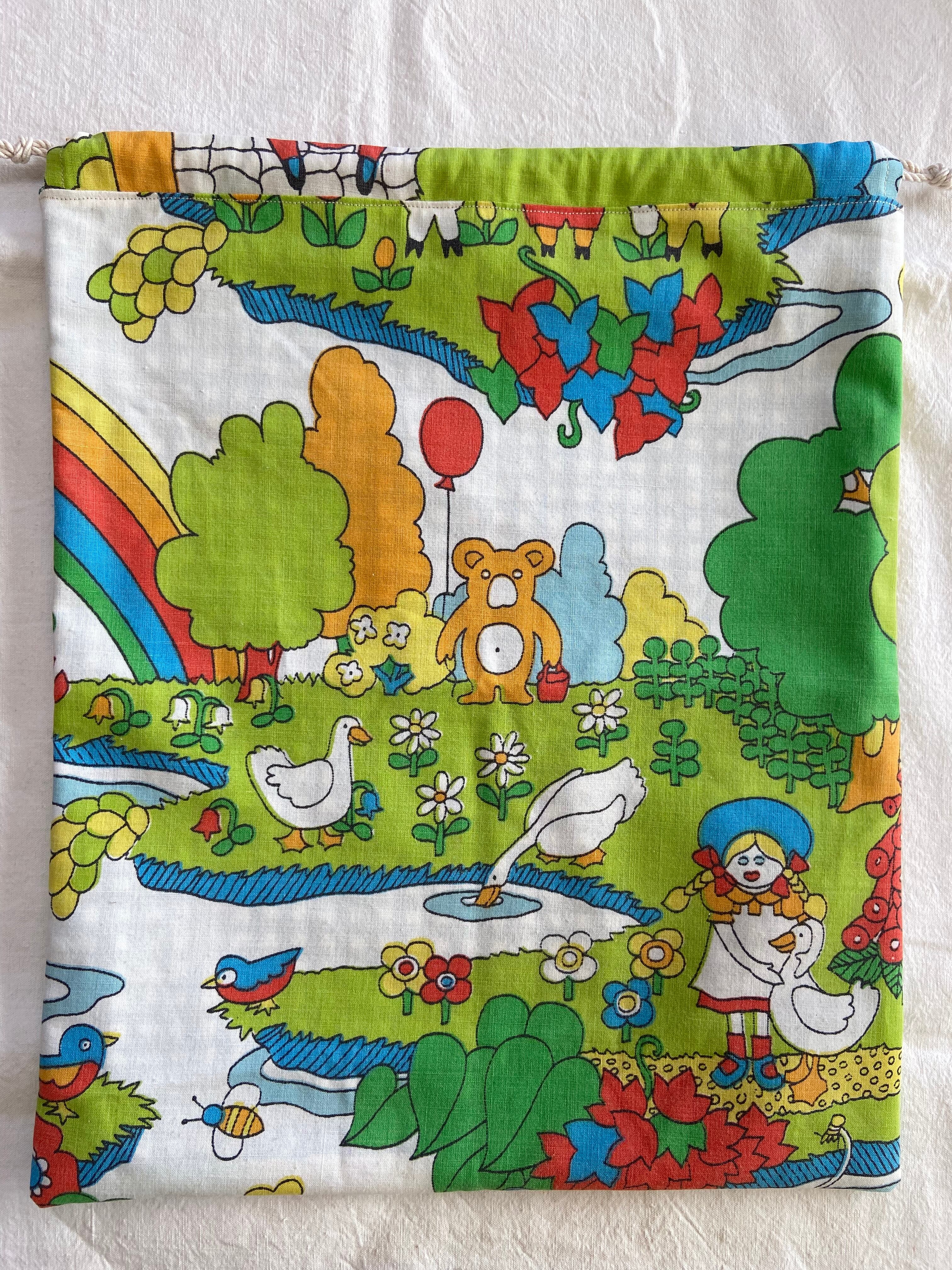 赤ずきんちゃんや、森のくまさん、ハンプティダンプティなどが、愉快に描かれています。虹やカラフルなお花達がとってもキュートです。