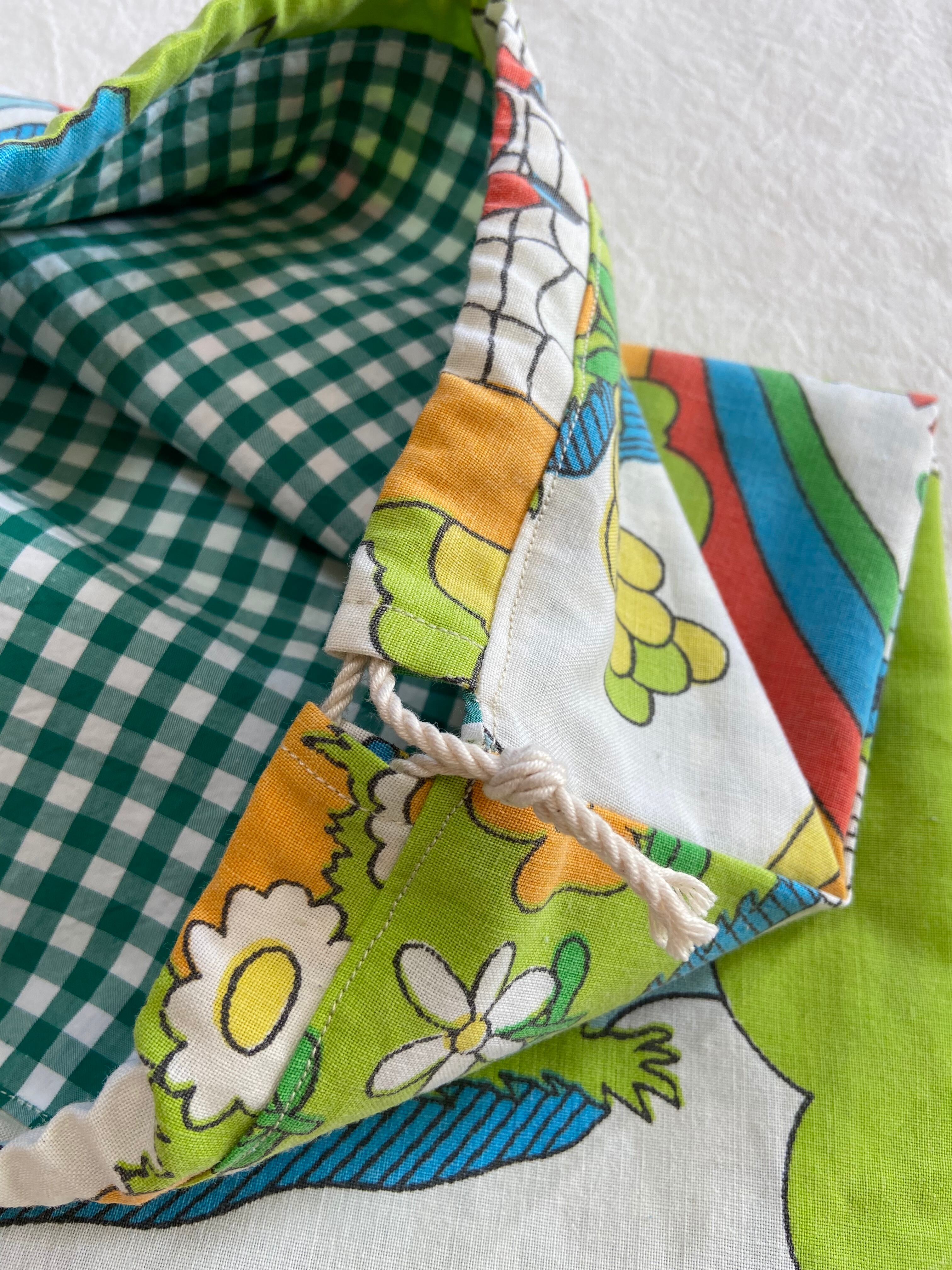 ビンテージシーツを利用している為、生地の色あせやダメージ、小さなシミ等見られることもありますが、それも味と思っていただけると嬉しいです。