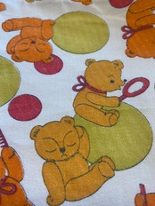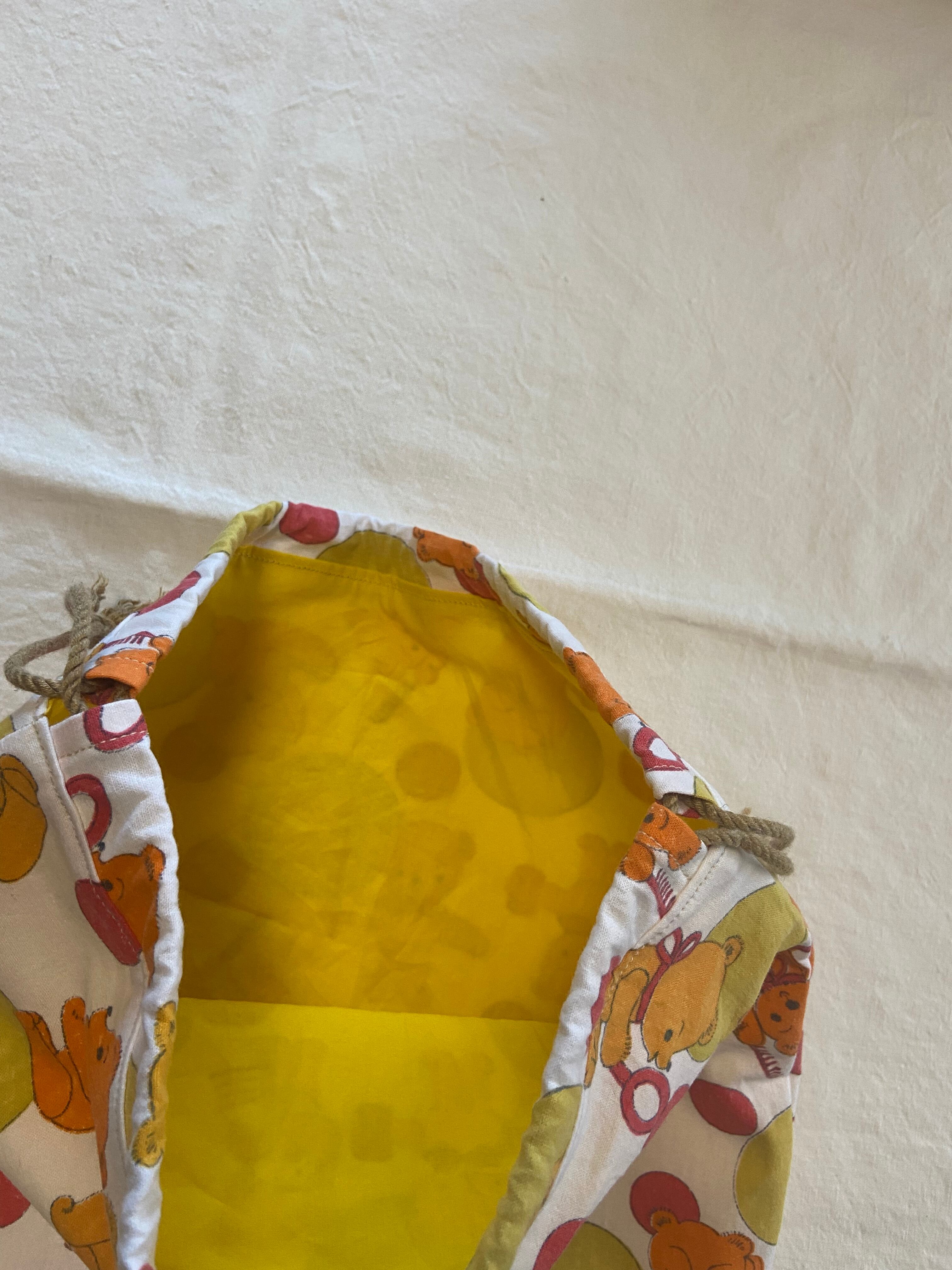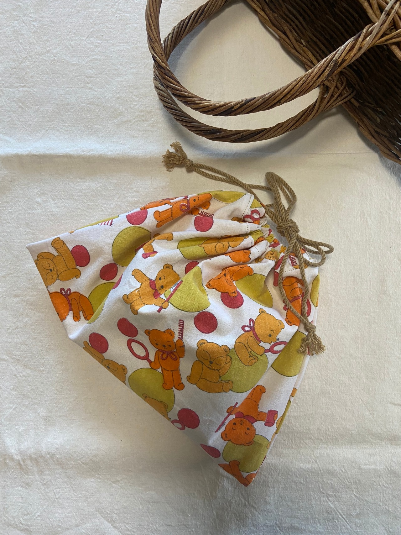 ヴィンテージファブリックで製作した巾着になります。くまが歯を磨いたり、顔を洗ったりと、お支度をしている様子が可愛いです♡