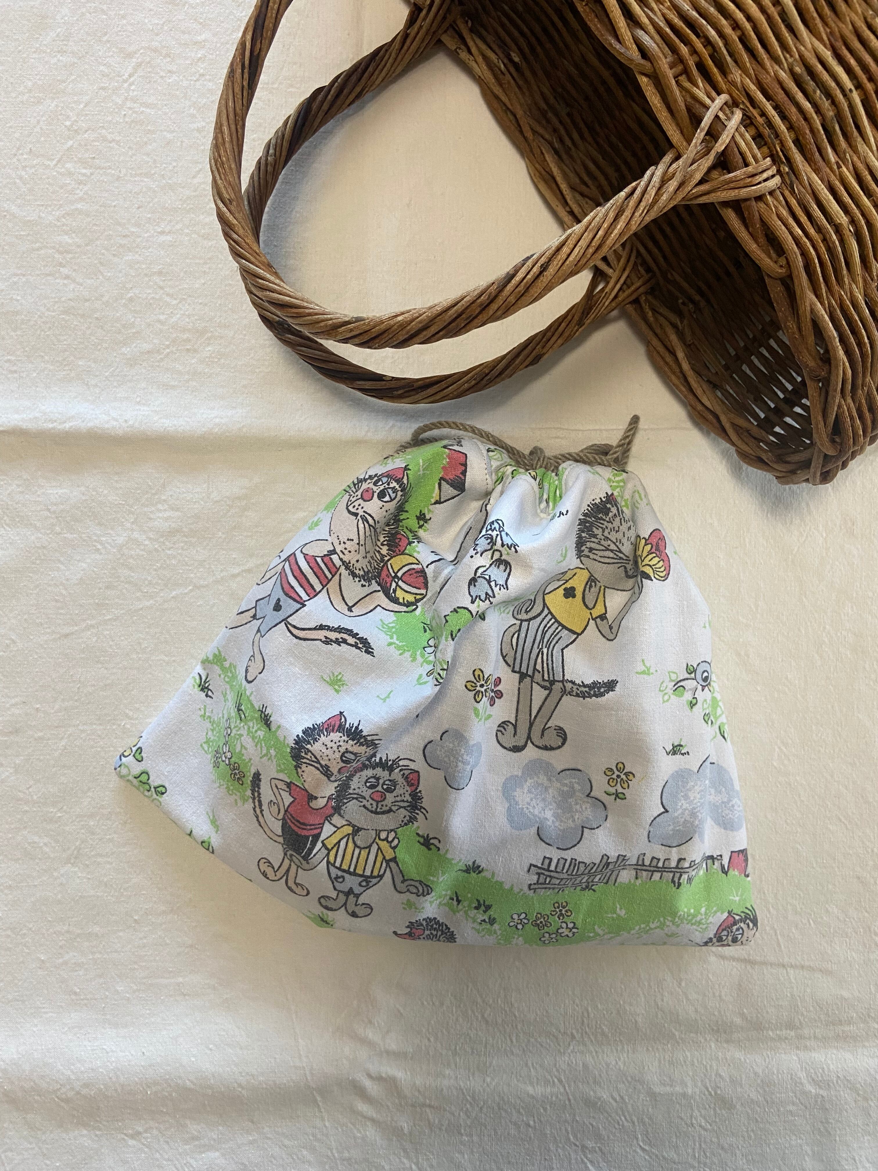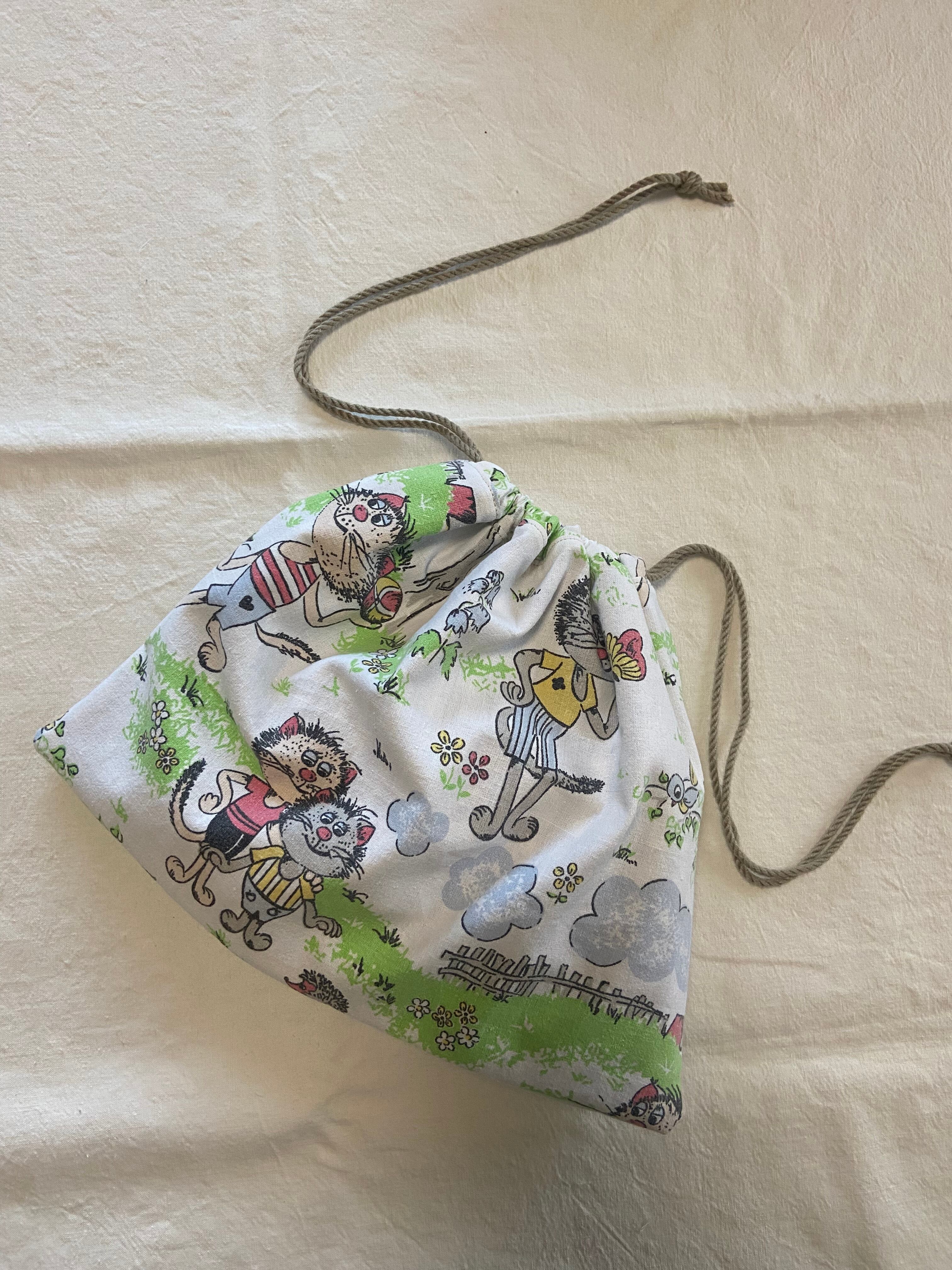 麻が混合された落ち着いたカラーの紐は長めにしております。薄着でしたら肩にかけることもできる長さなので、ちょっとしたお買い物やご近所でしたら巾着だけ持っていかれても良さそうです。