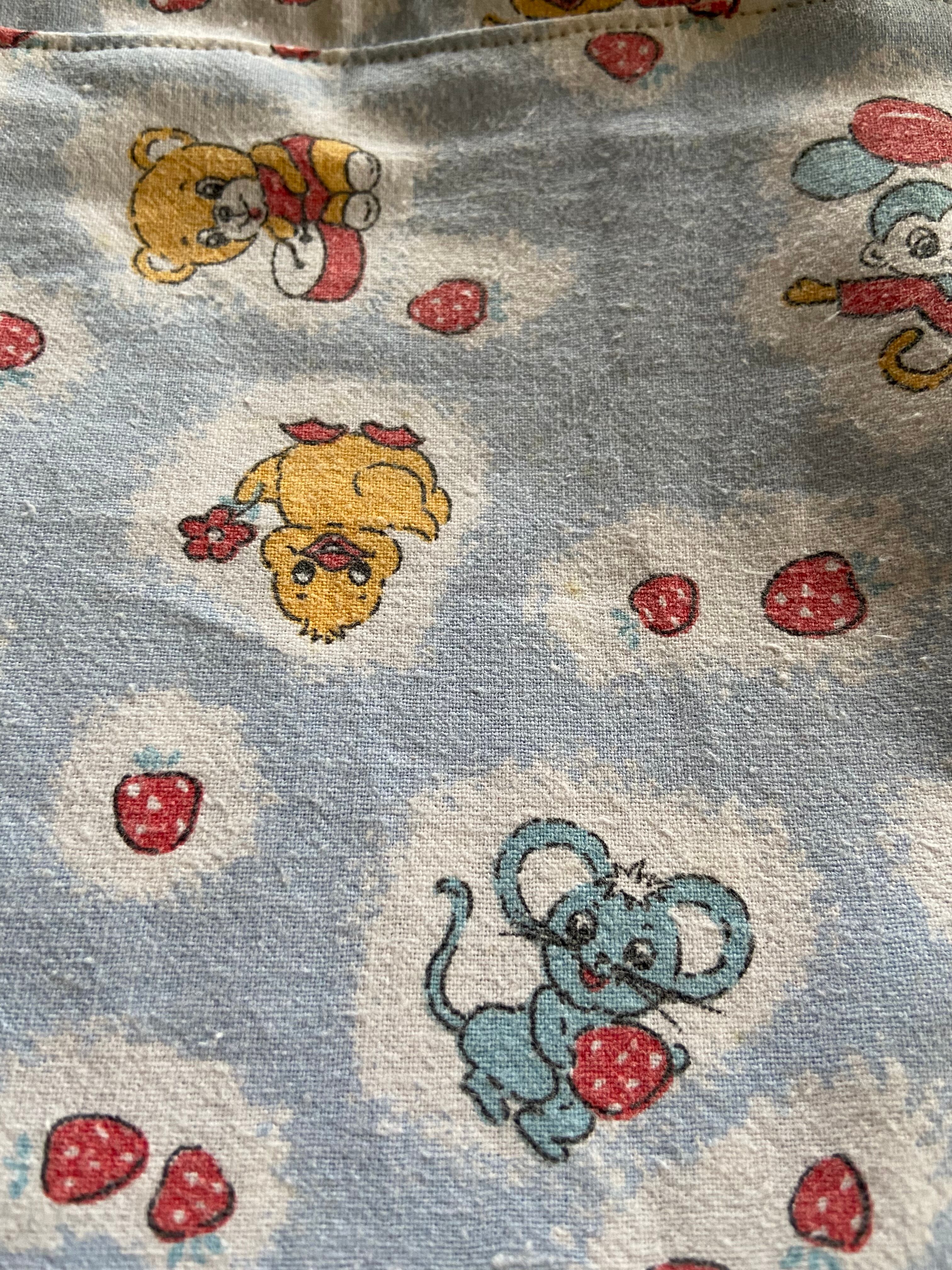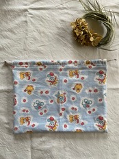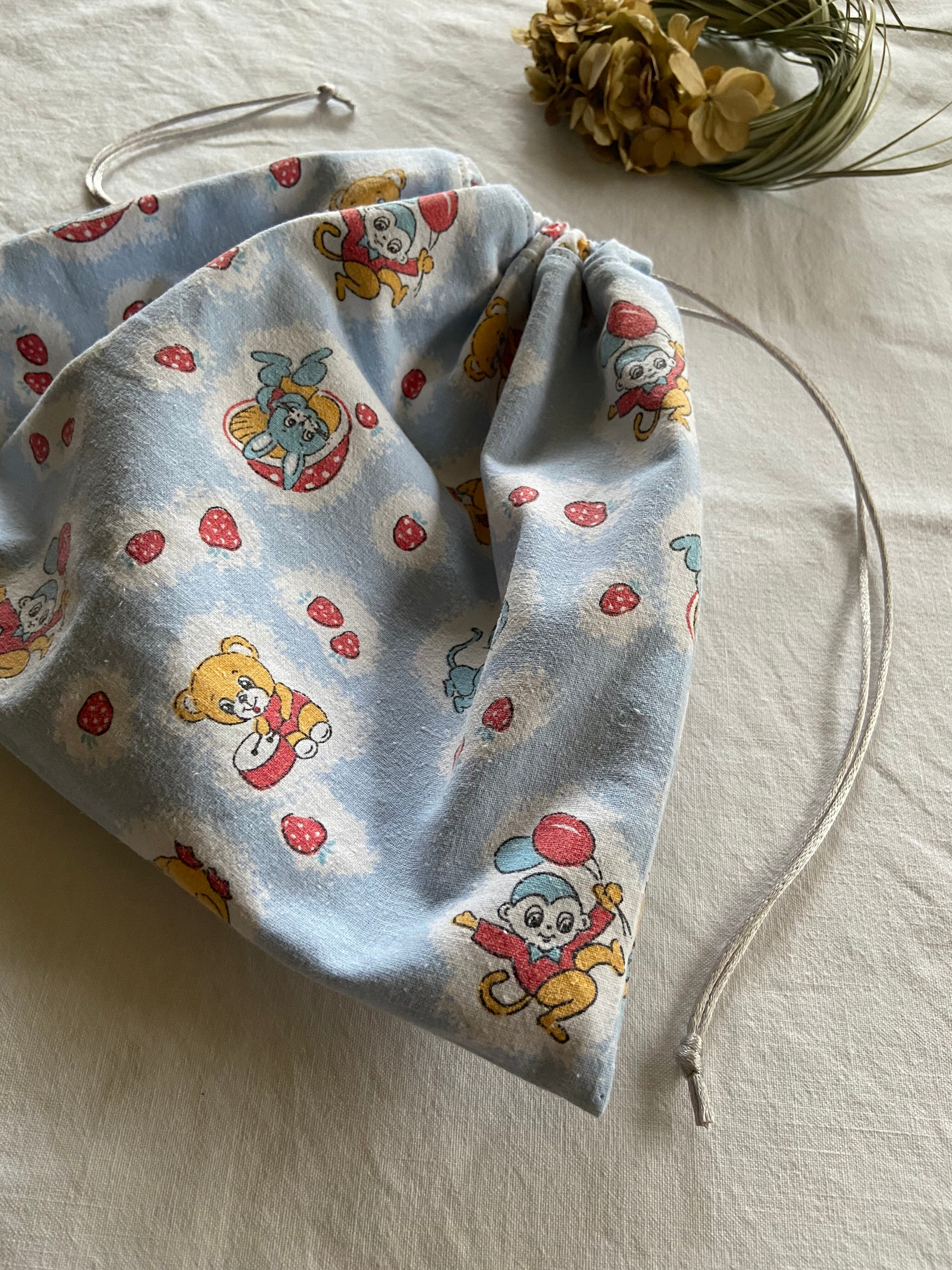 ドイツのヴィンテージファブリックで製作した巾着になります。ねずみやサル、ひよこ、くまたちが、それぞれ思い思いのアイテムを手に、楽しそうにしている様子がかわいいです。