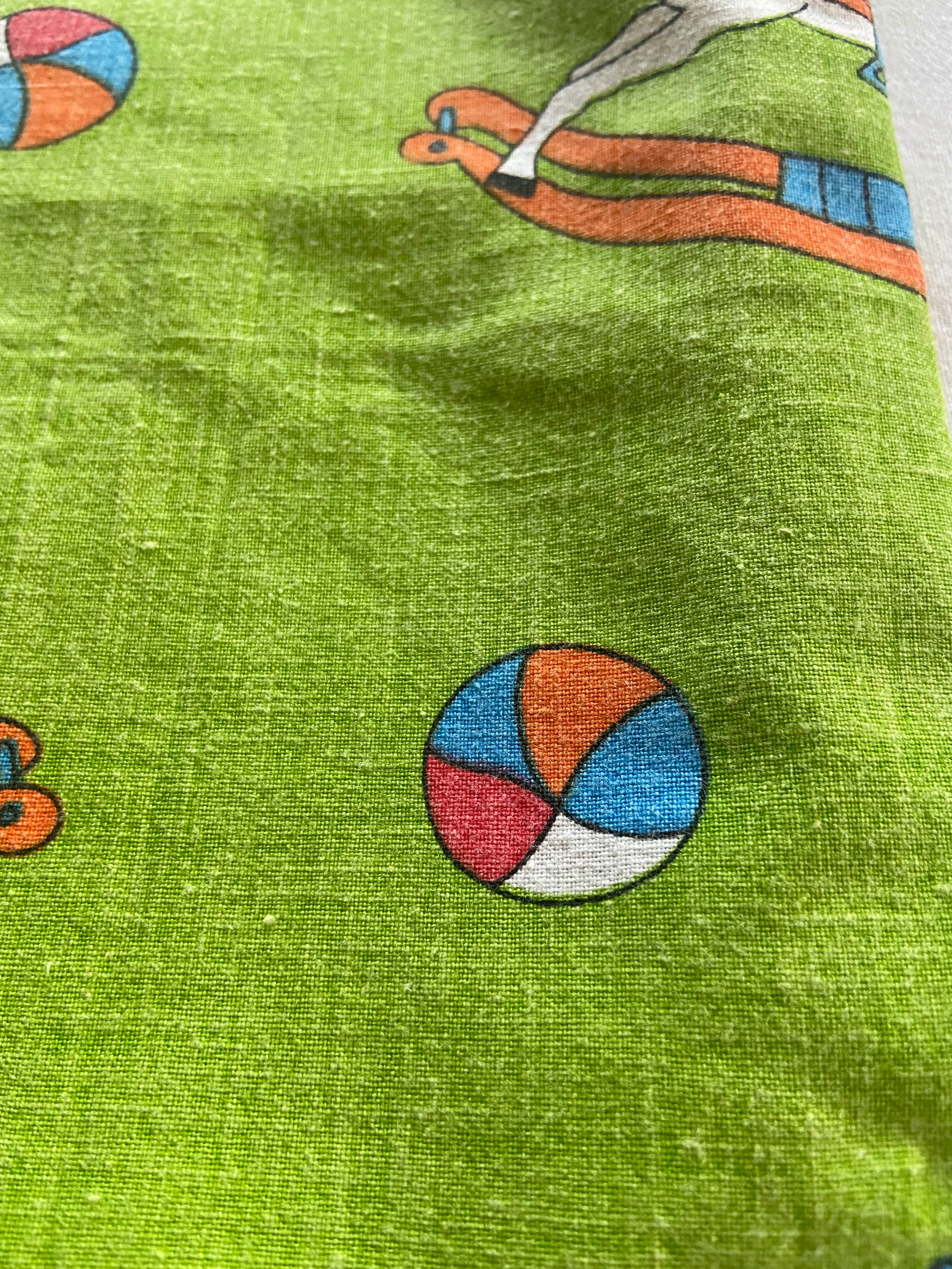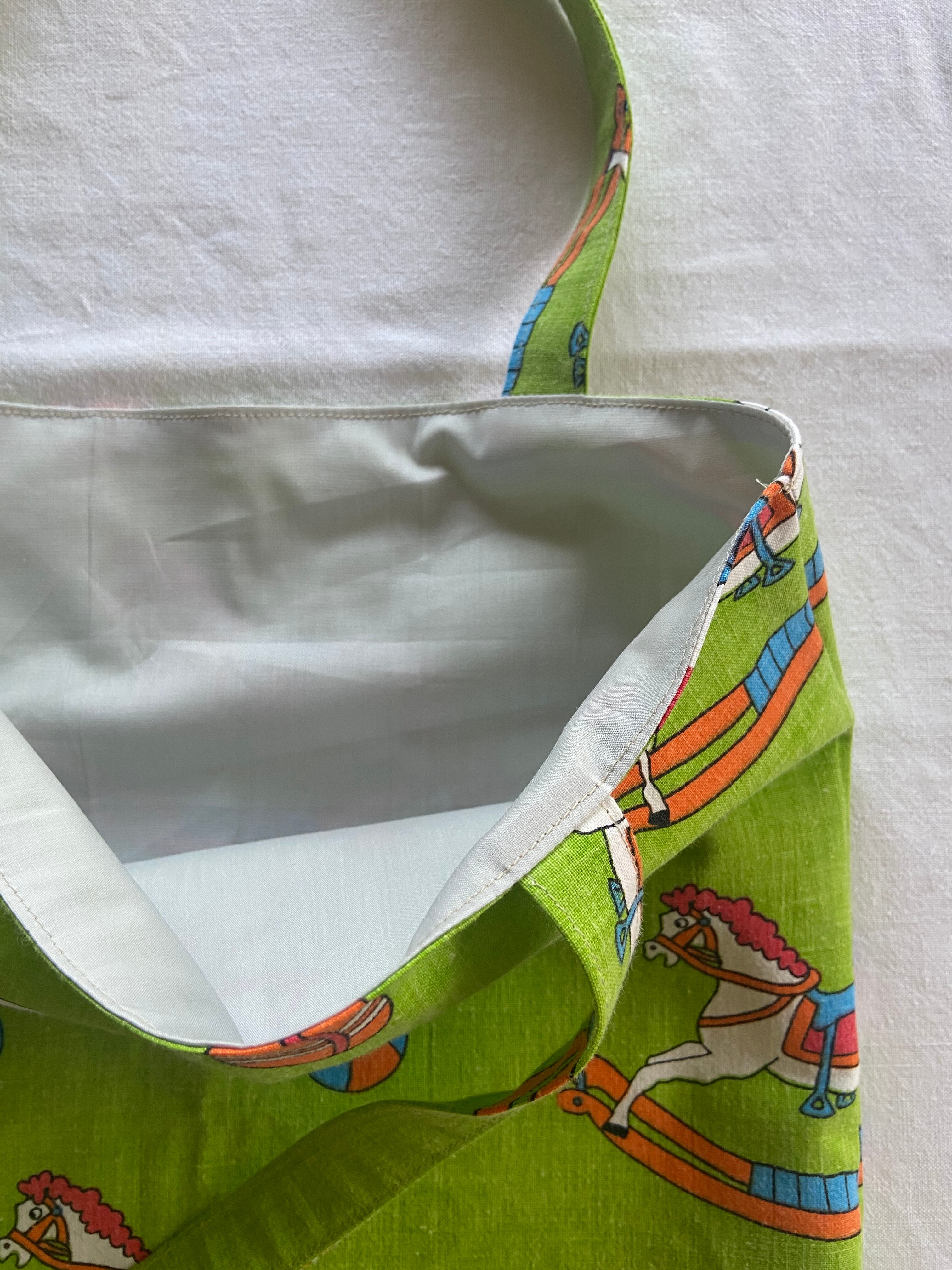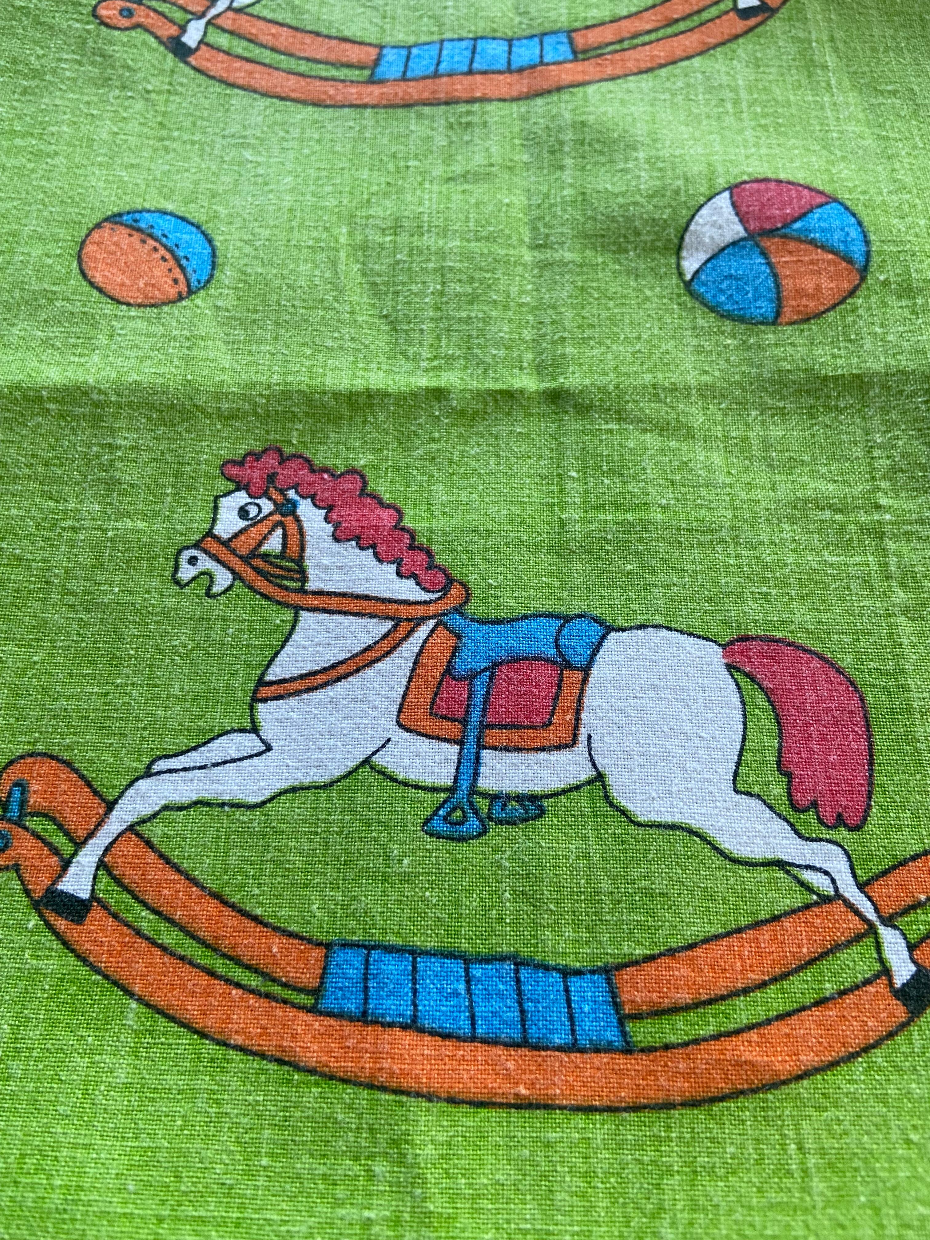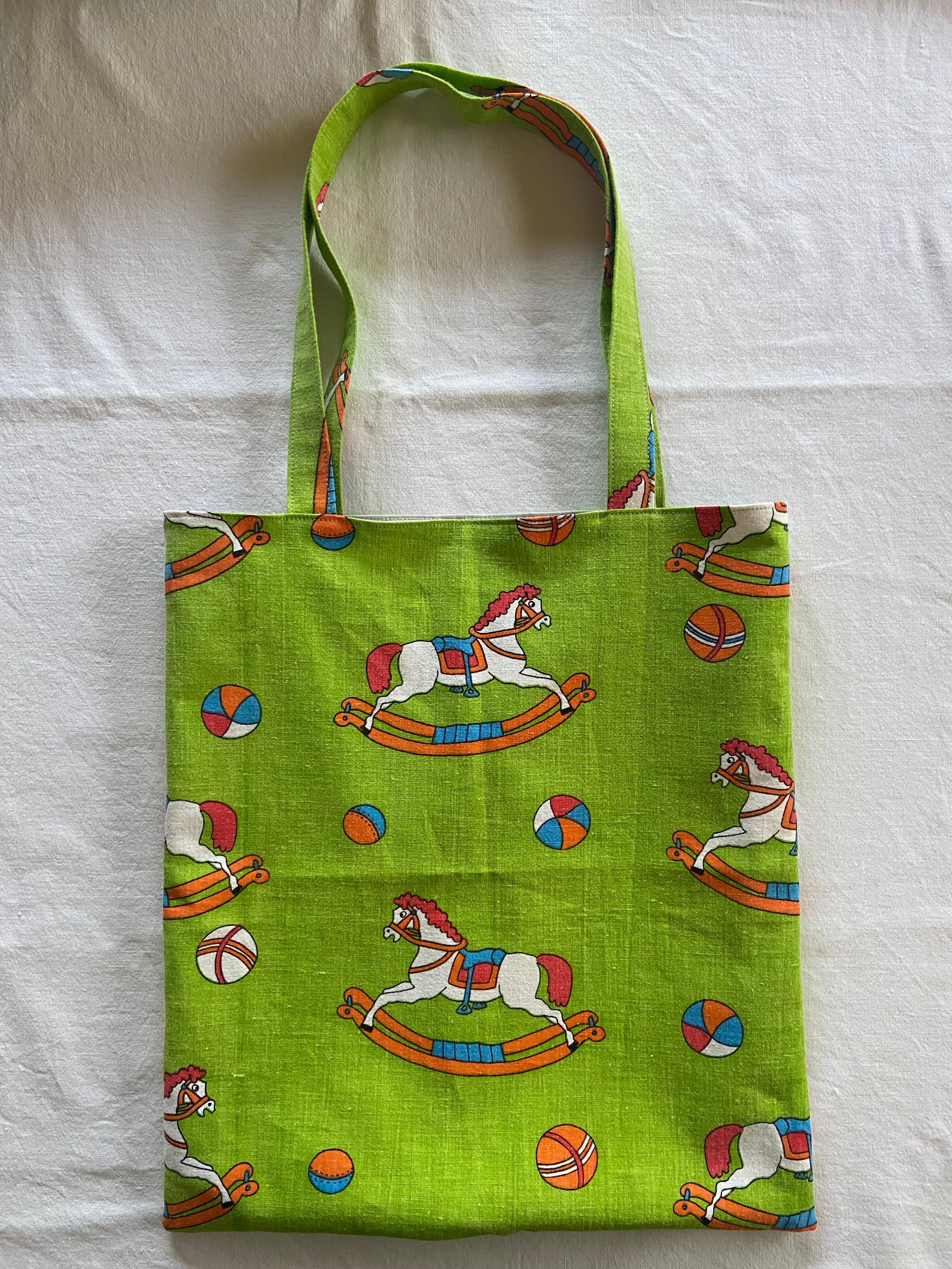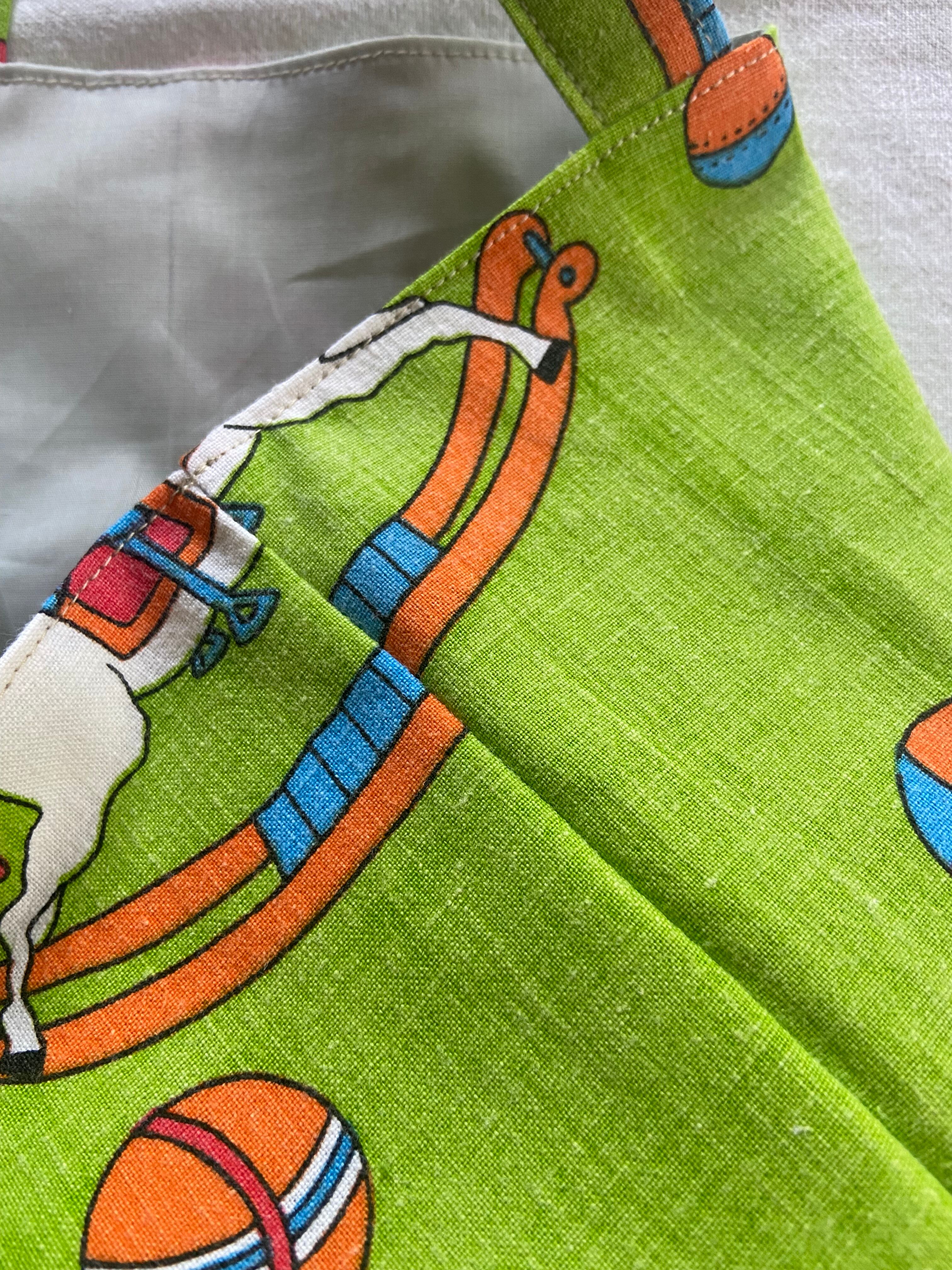 ドイツのビンテージシーツで制作したトートバッグになります。カラフルな木馬やボールが描かれており、見ているだけでとってもハッピーになっちゃいます♡