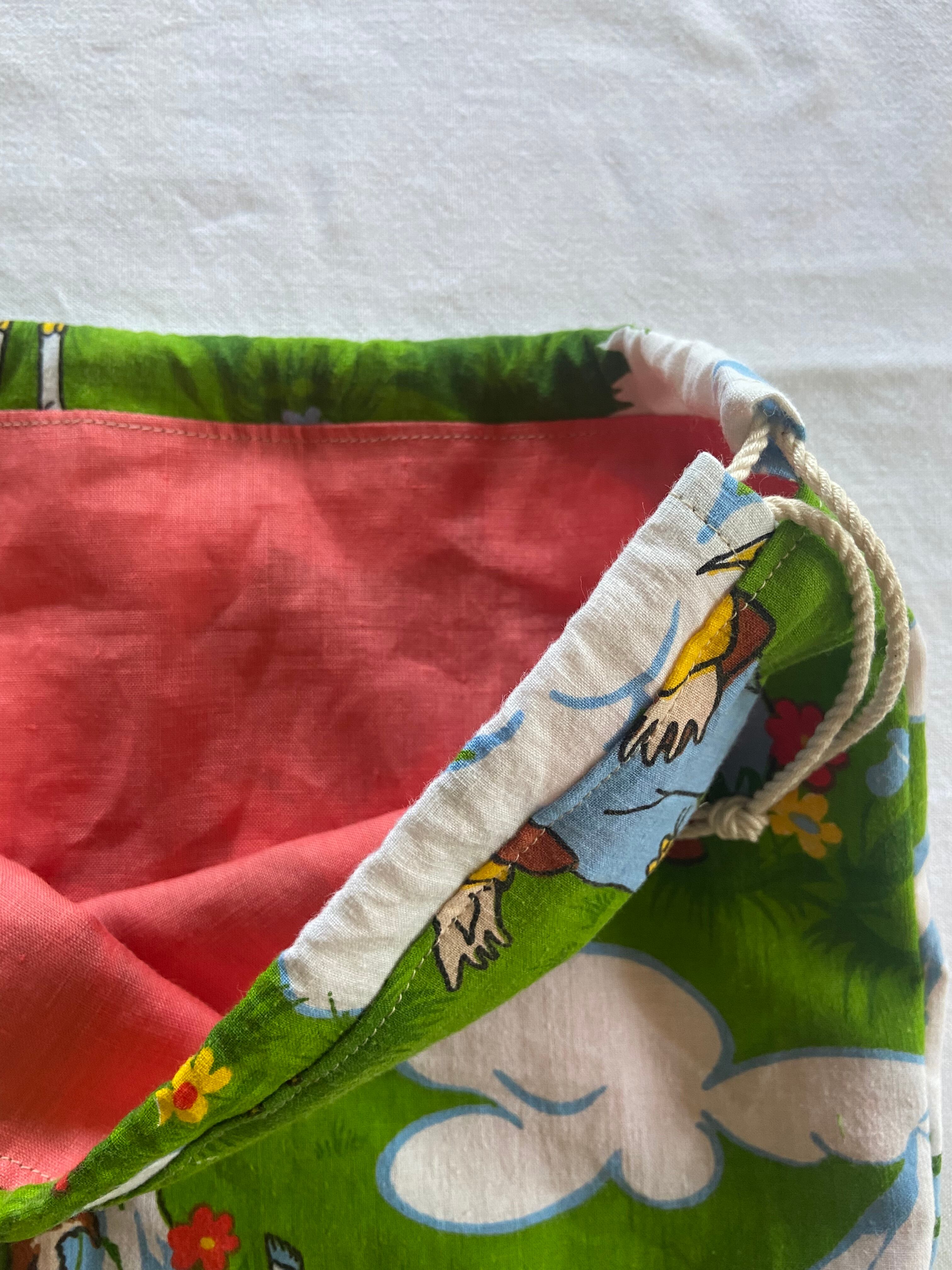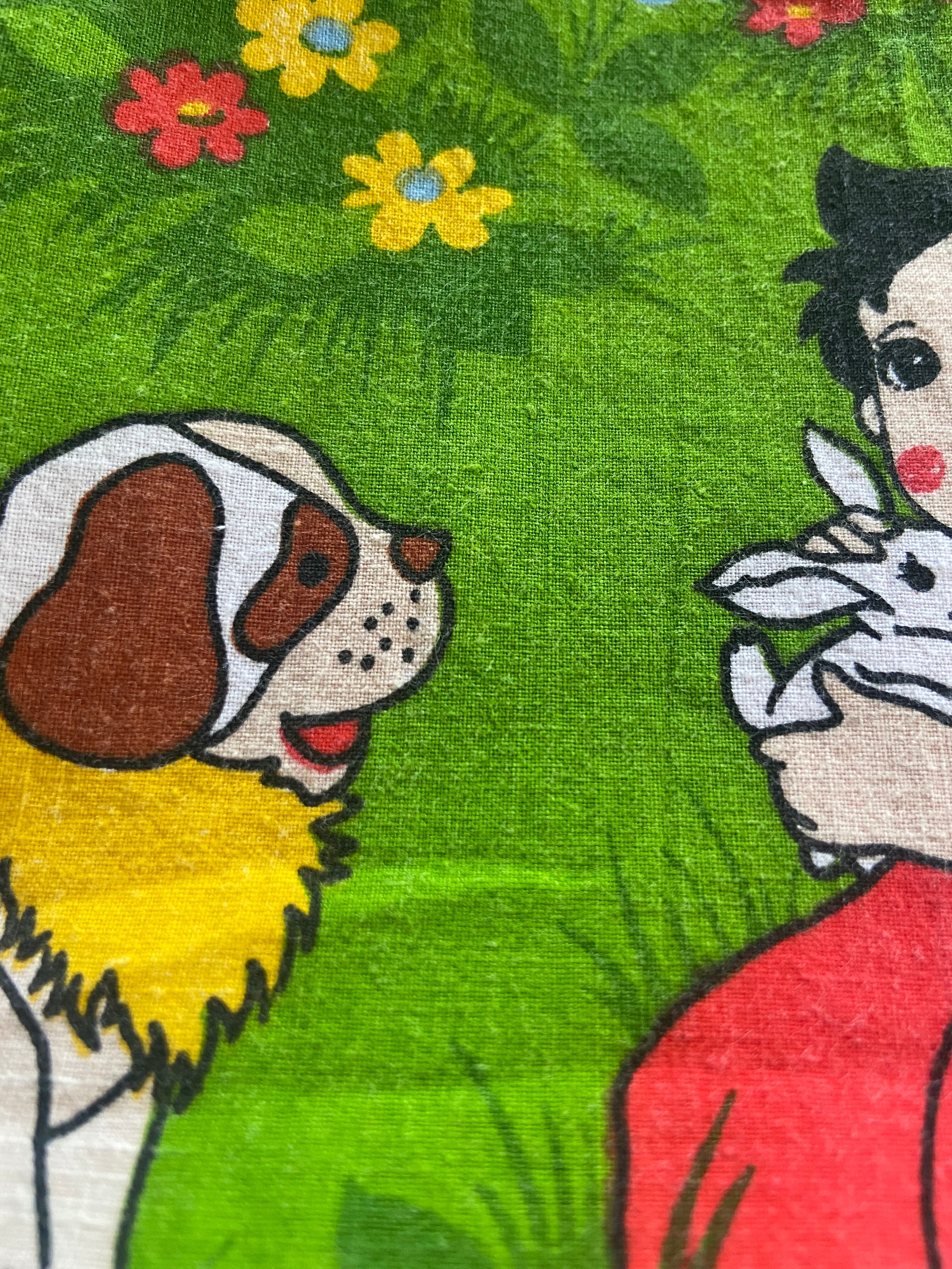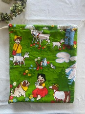 フランスのヴィンテージファブリックで製作したアルプスの少女ハイジの巾着になります。原色のカラフルな色合いで、シュールな表情の人物たちが可愛いです♡