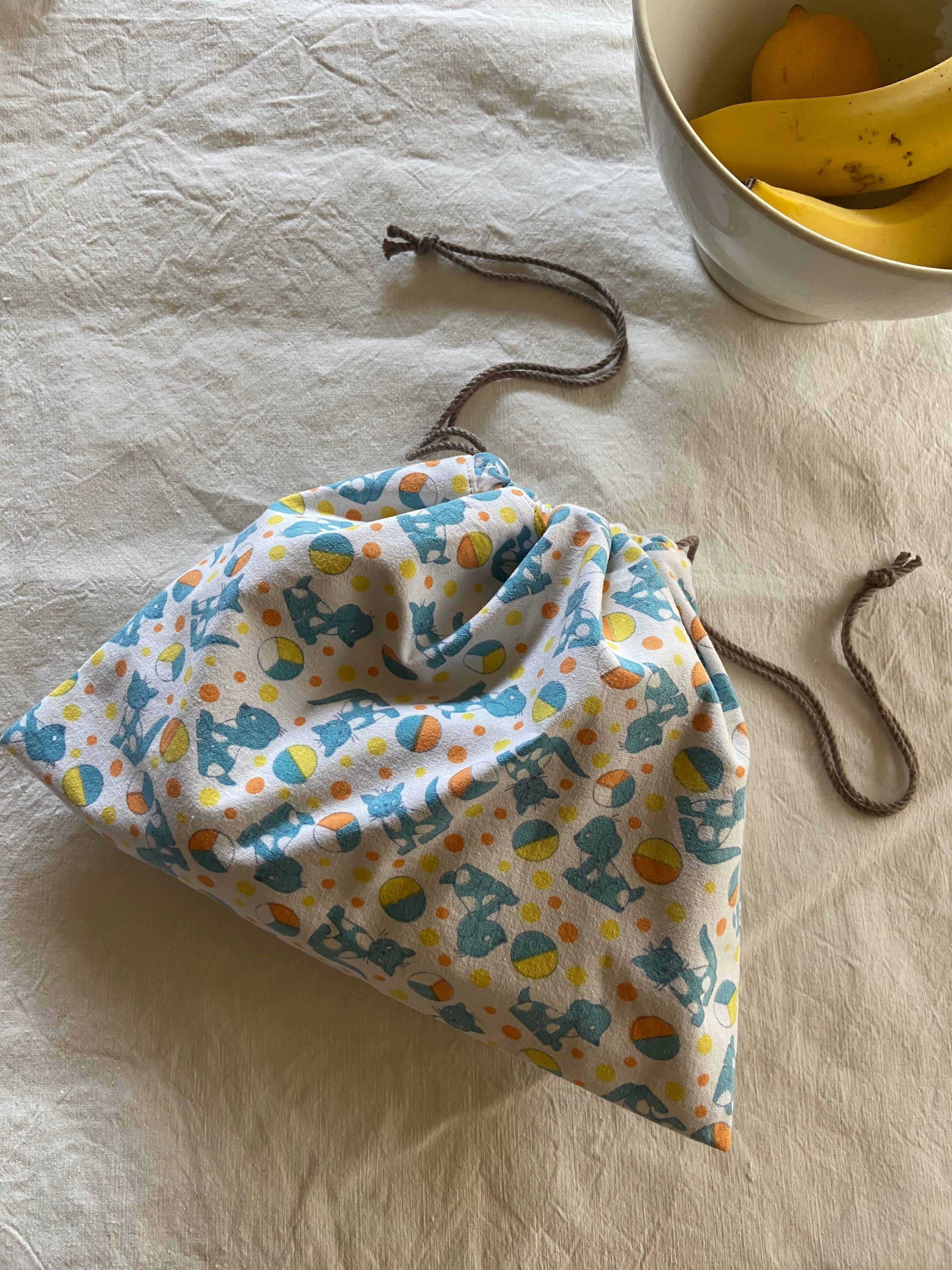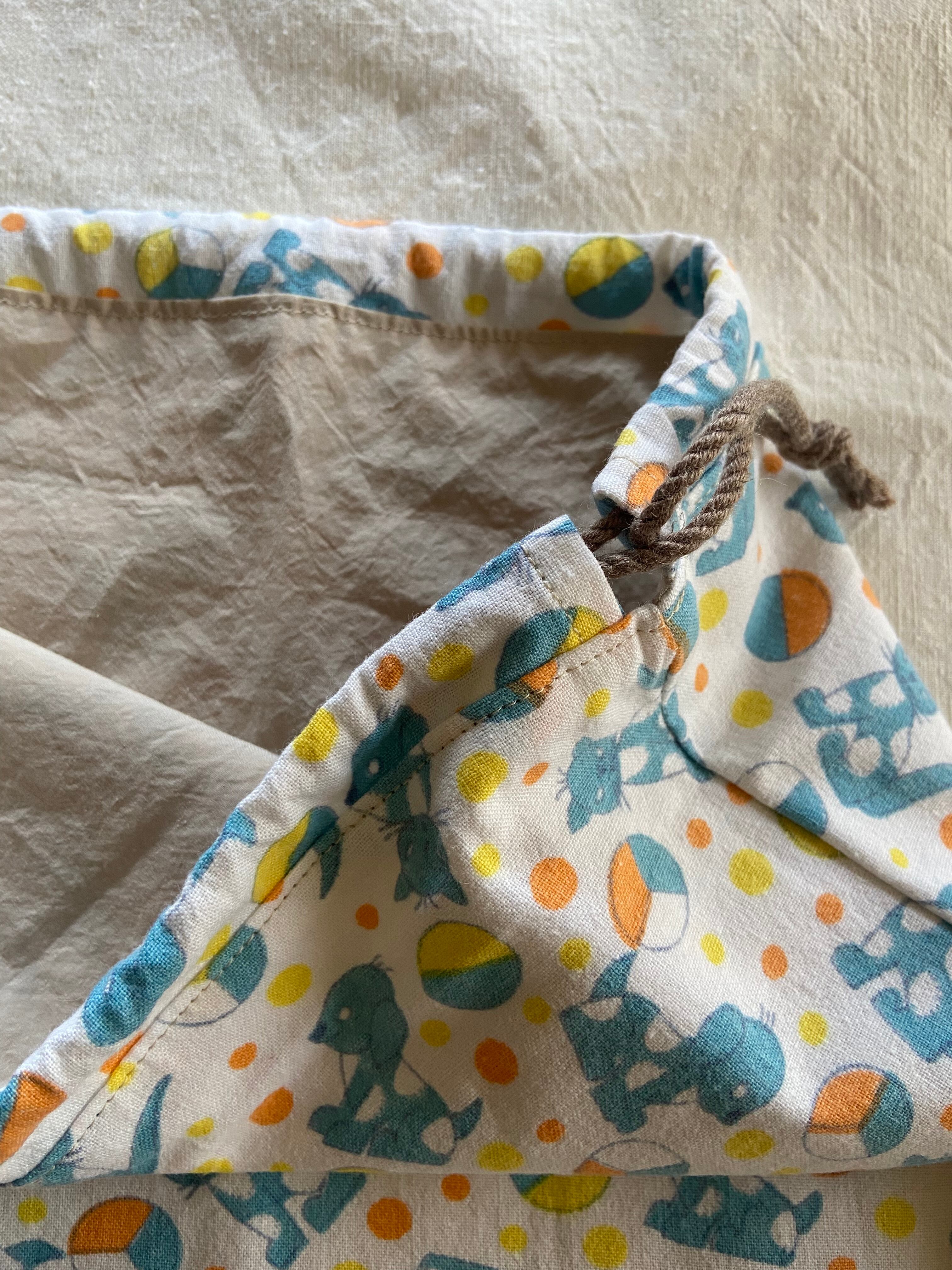 ドイツのヴィンテージファブリックで製作した巾着になります。ねこや犬、ボールがたくさん並んでおります。どこか懐かしい感じのする色合いです。
