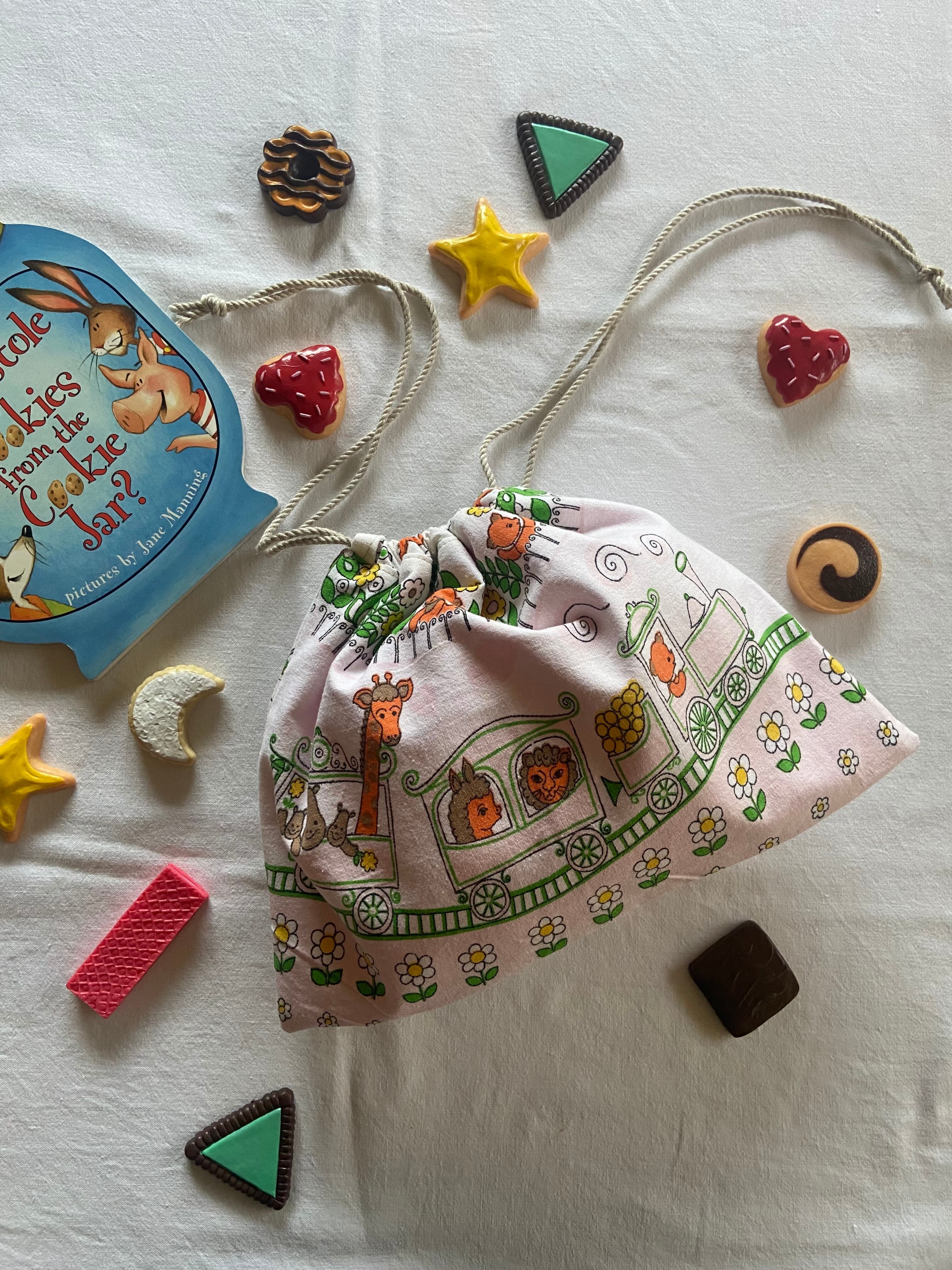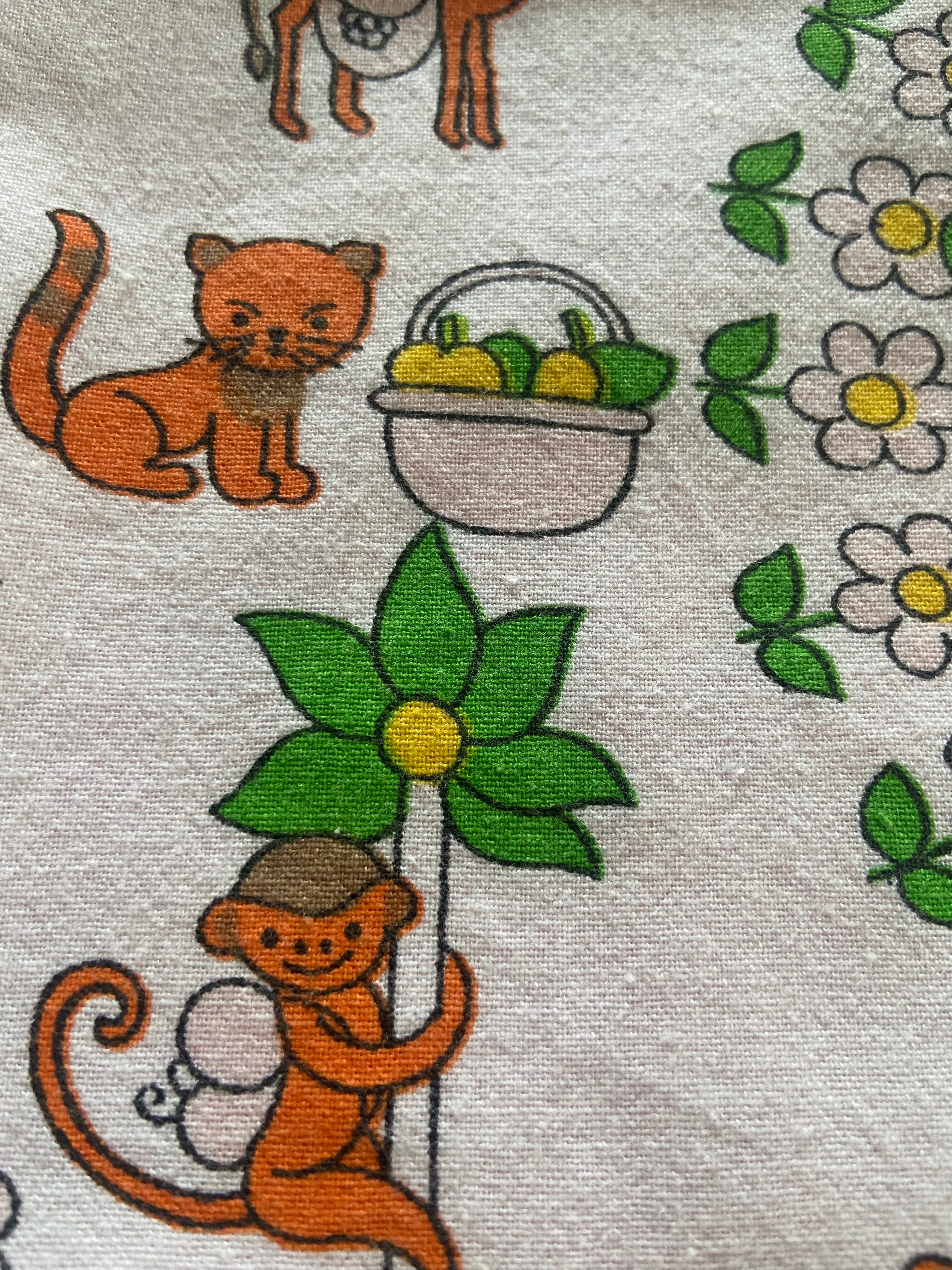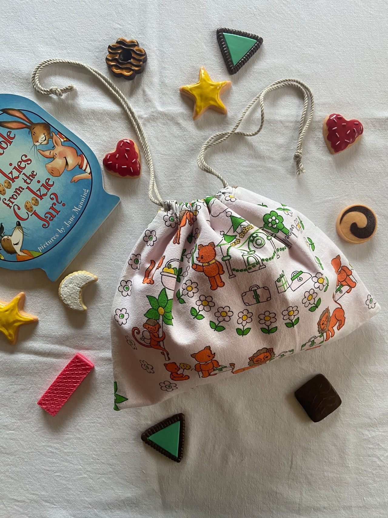 ヴィンテージファブリックで製作した巾着になります。ライオンやぞう、くま、キリンなど人気動物達が遊園地で楽しく遊んでいる様子が描かれている、とっても可愛い生地です♡