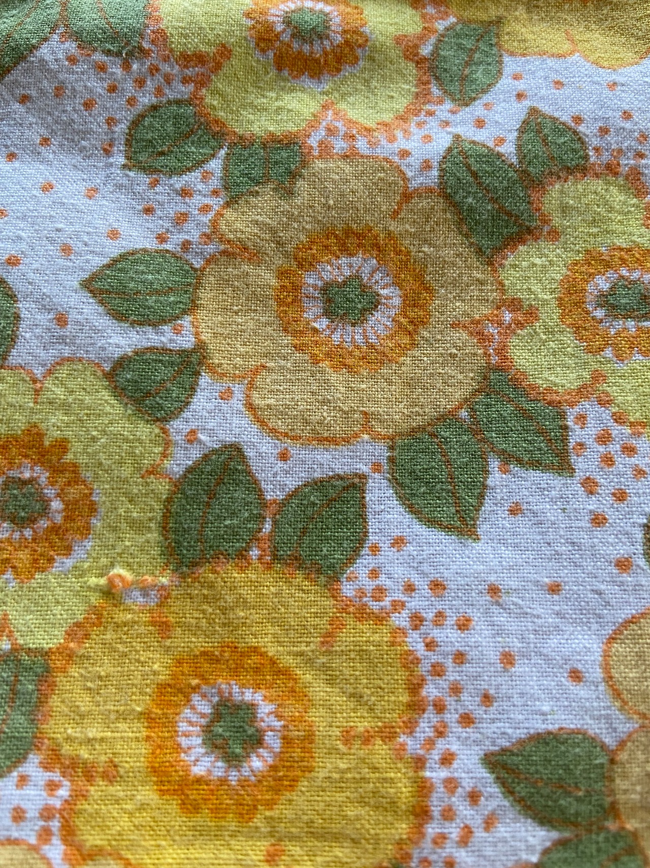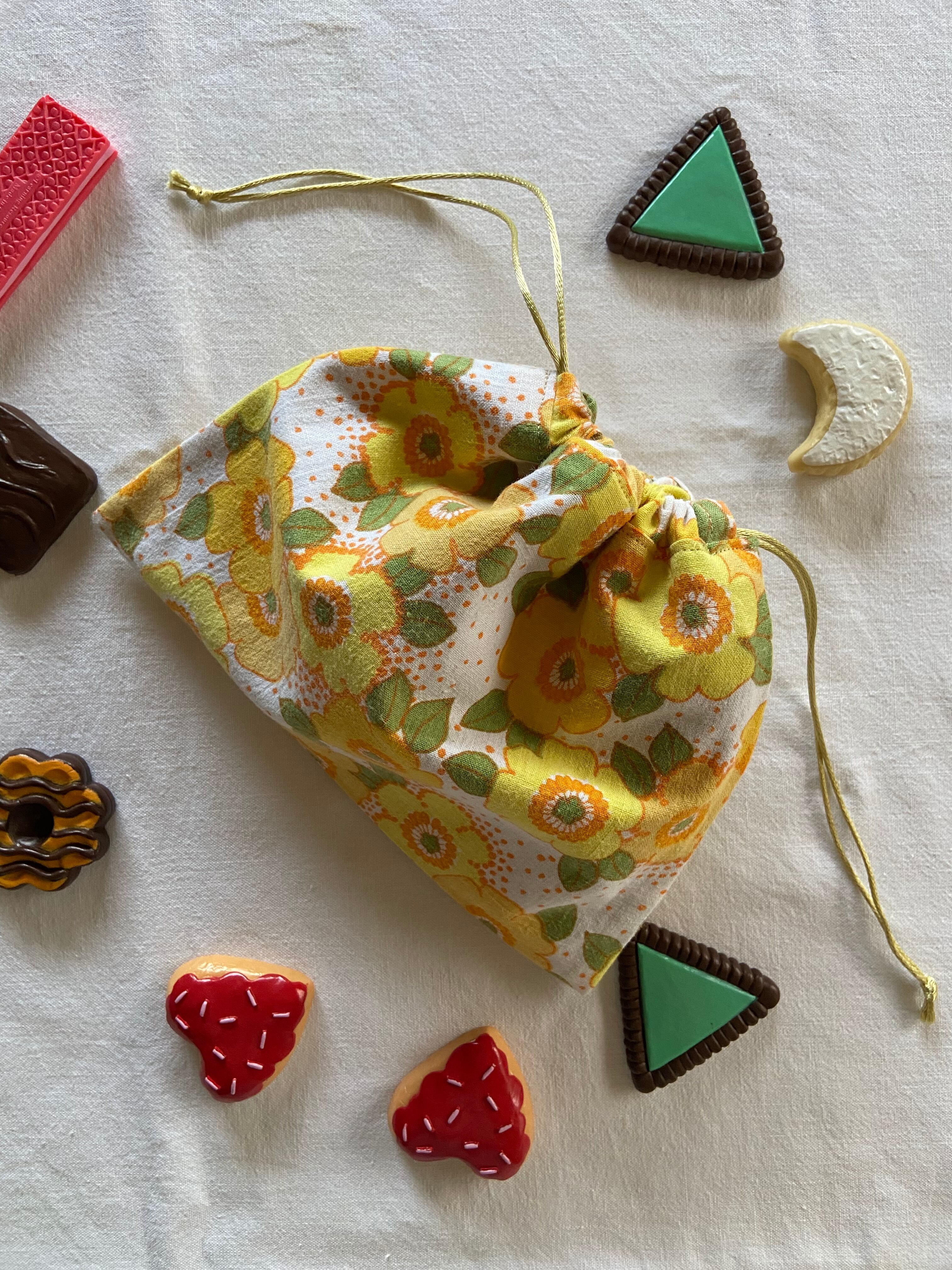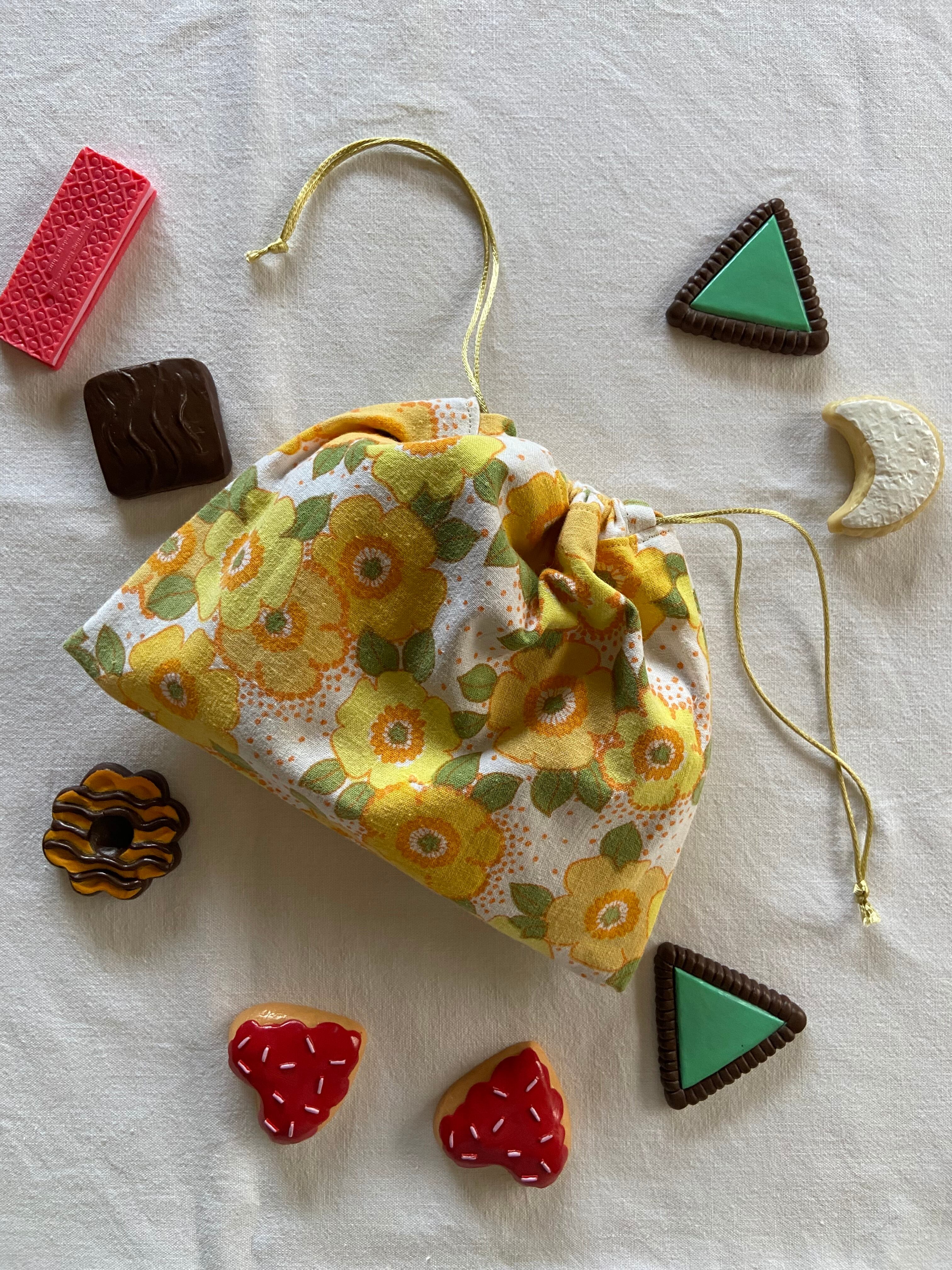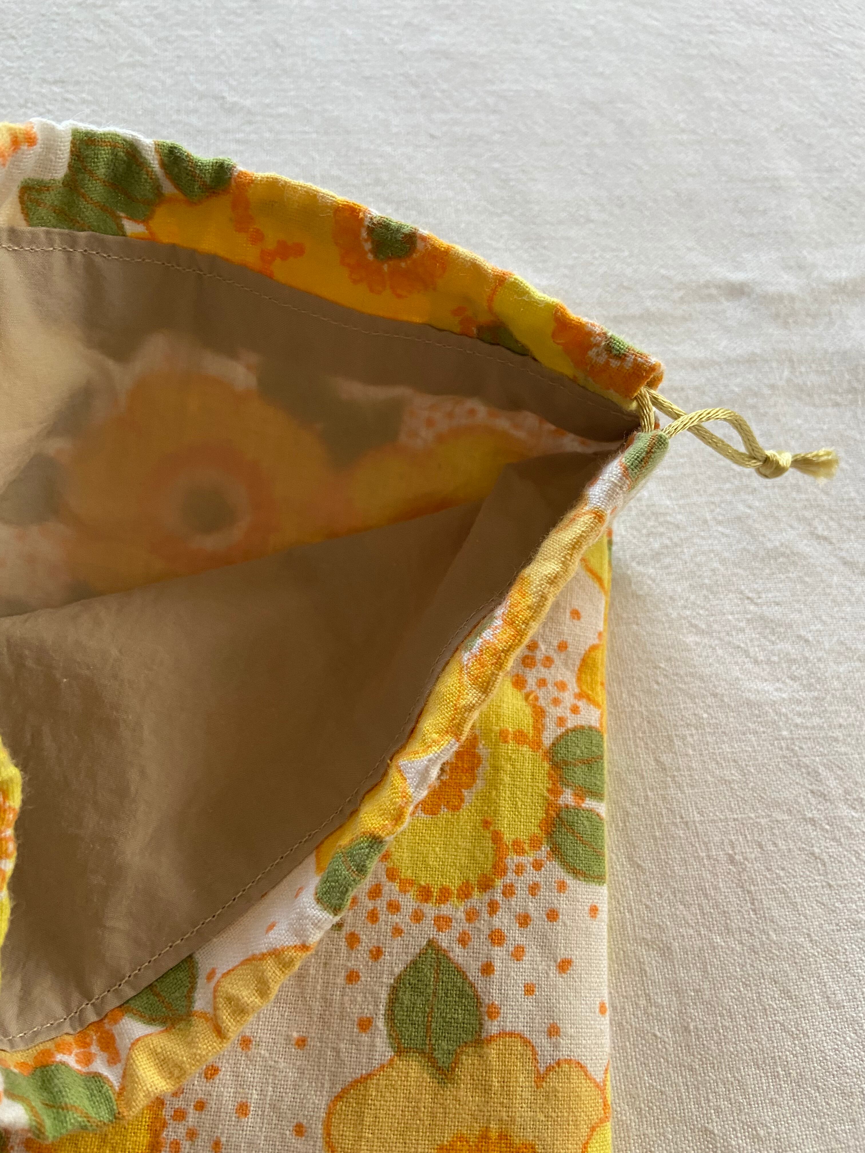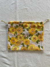 ドイツのヴィンテージファブリックで製作した巾着になります。ビンテージ感たっぷりの生地で、どこか日本の浴衣のような雰囲気もあります