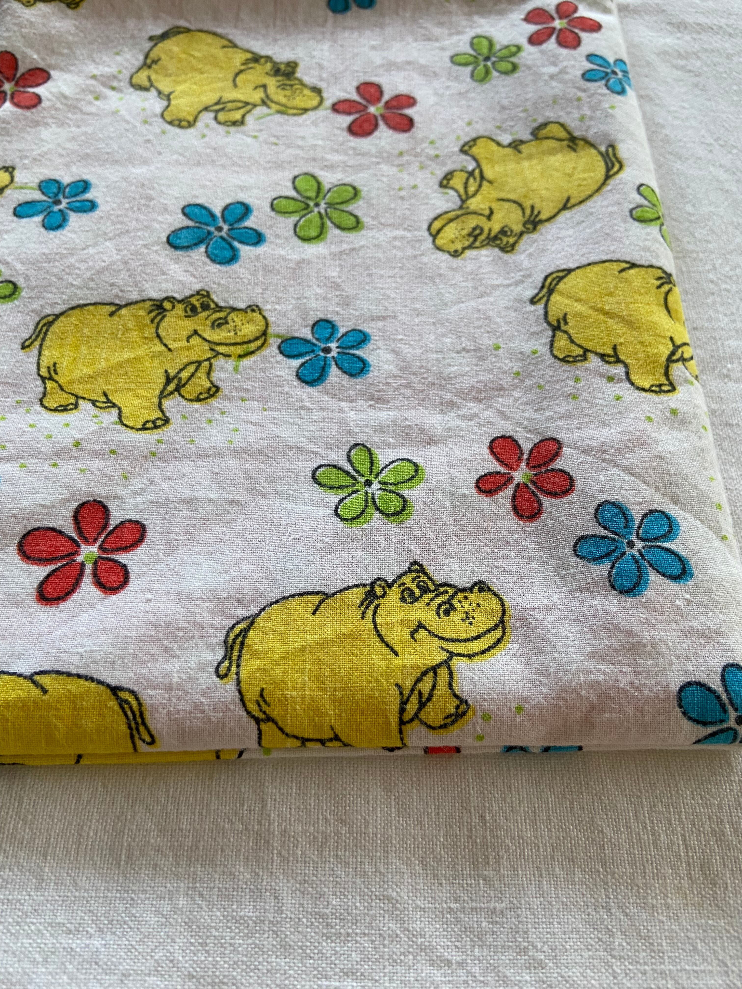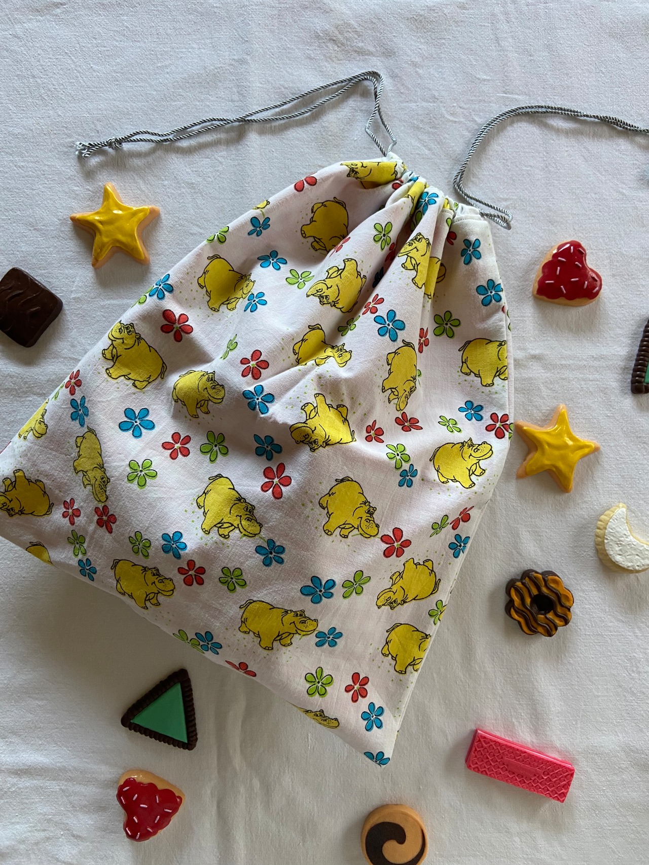 ドイツのビンテージシーツで制作した巾着になります。たくさんの黄色いカバちゃんたち^ ^見ているだけでとってもハッピーになっちゃいます♡
