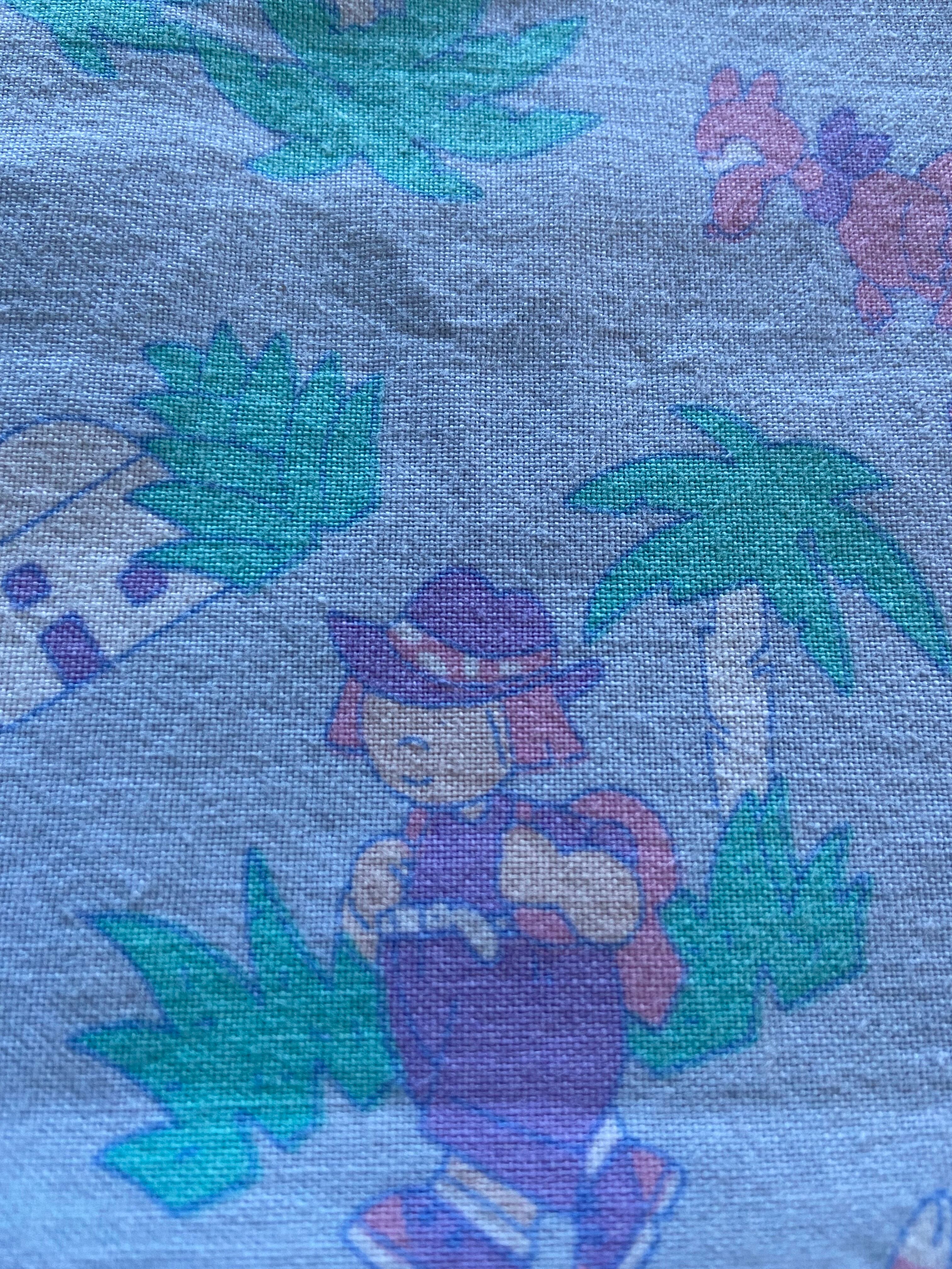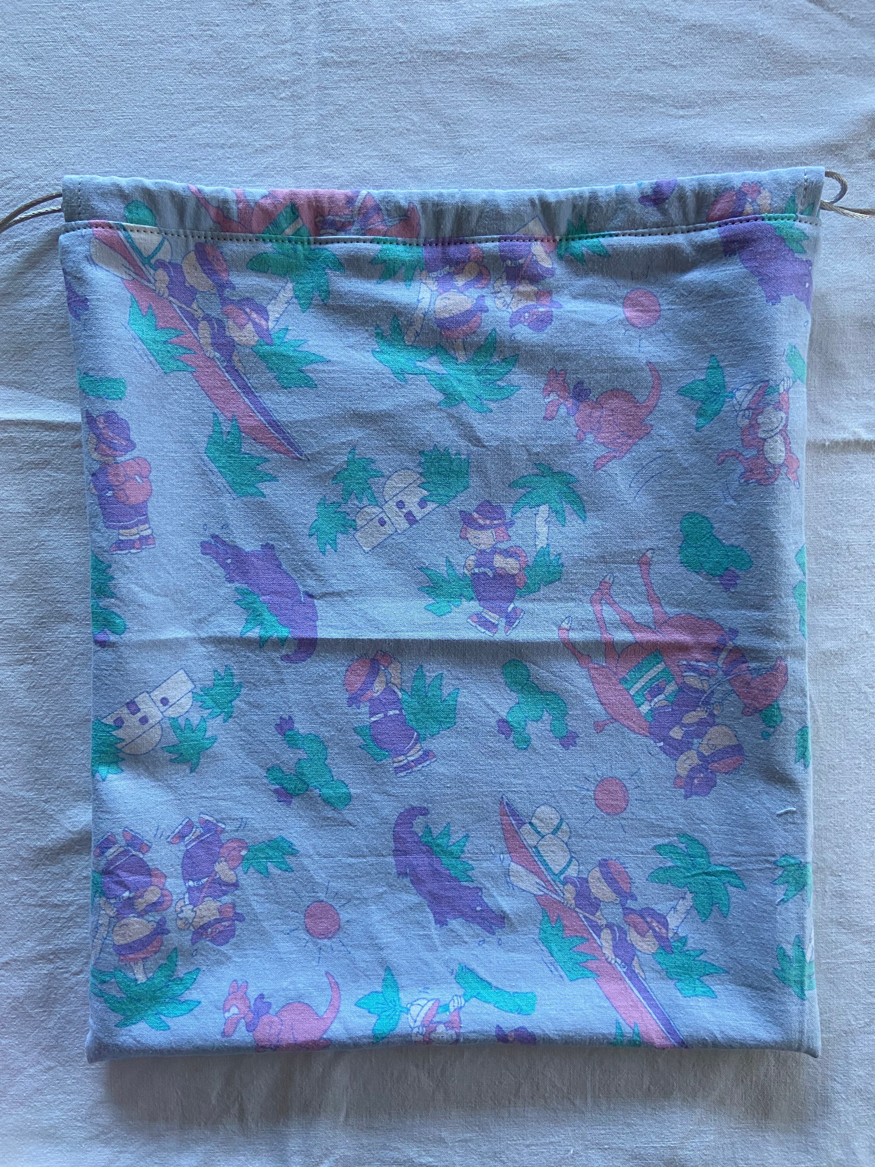 フランスのヴィンテージファブリックで製作した巾着(大)になります。懐かしい感じの淡い色合いで、子どもたちがジャングルを探検する様子が描かれております。
