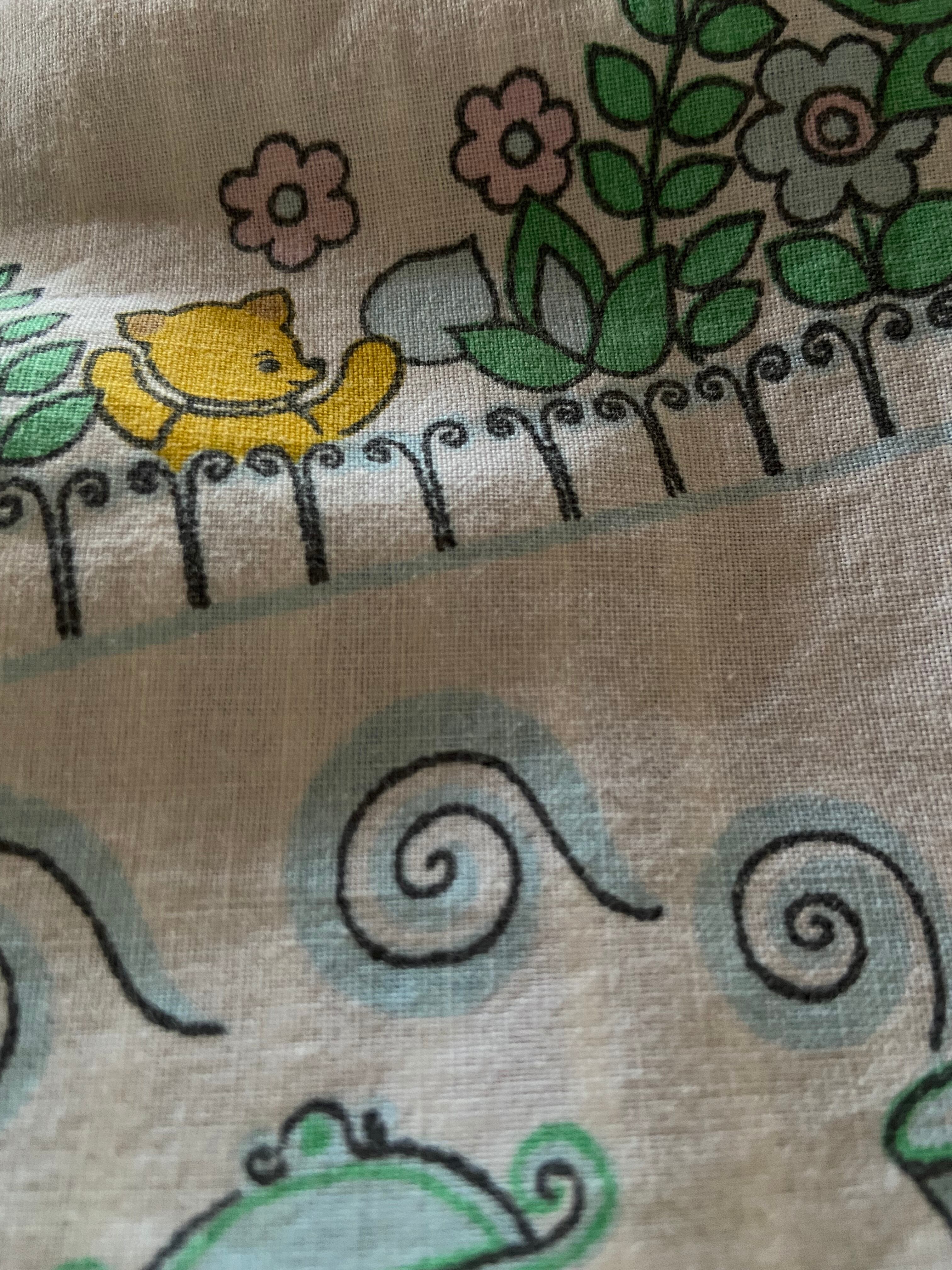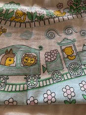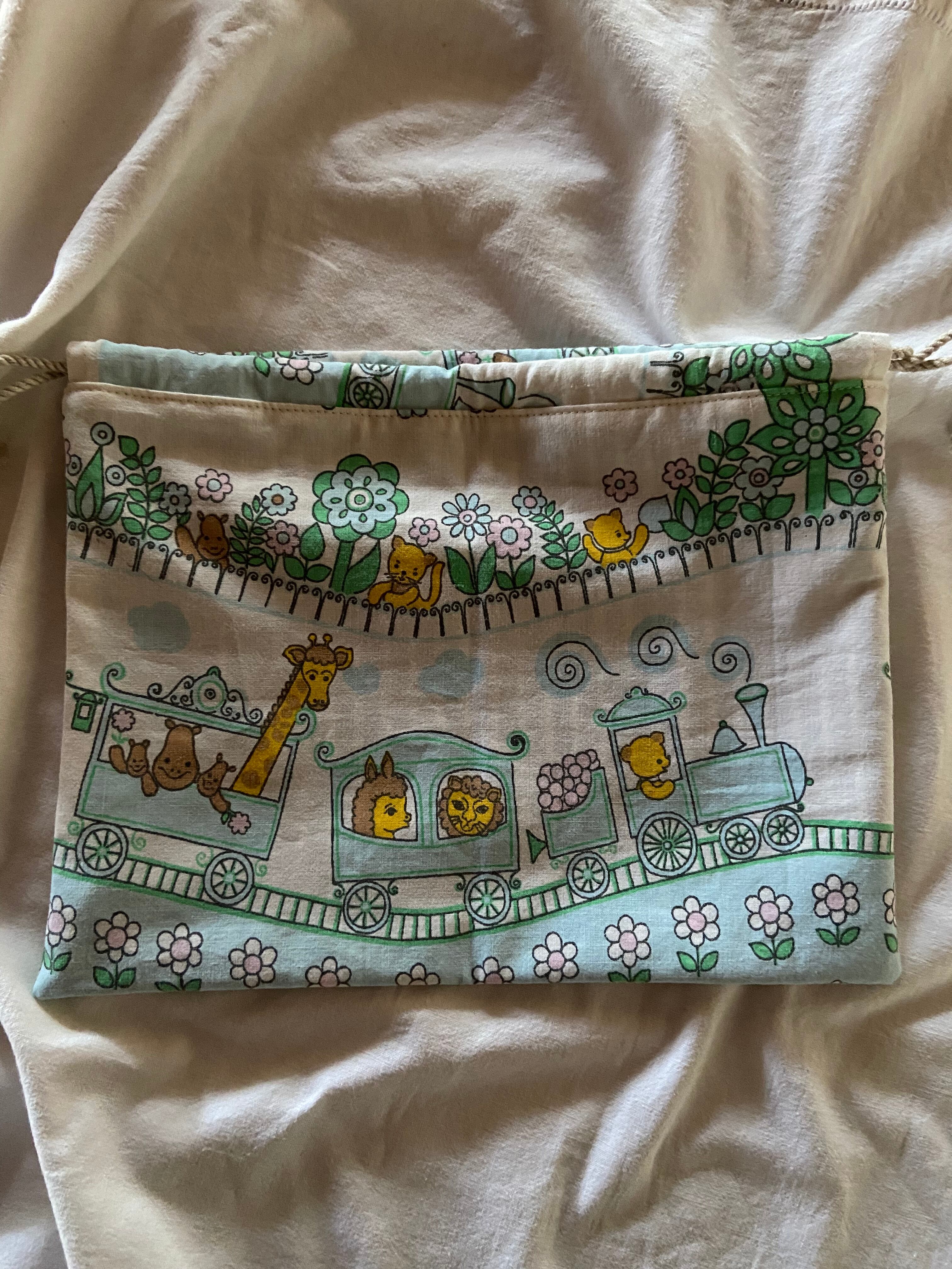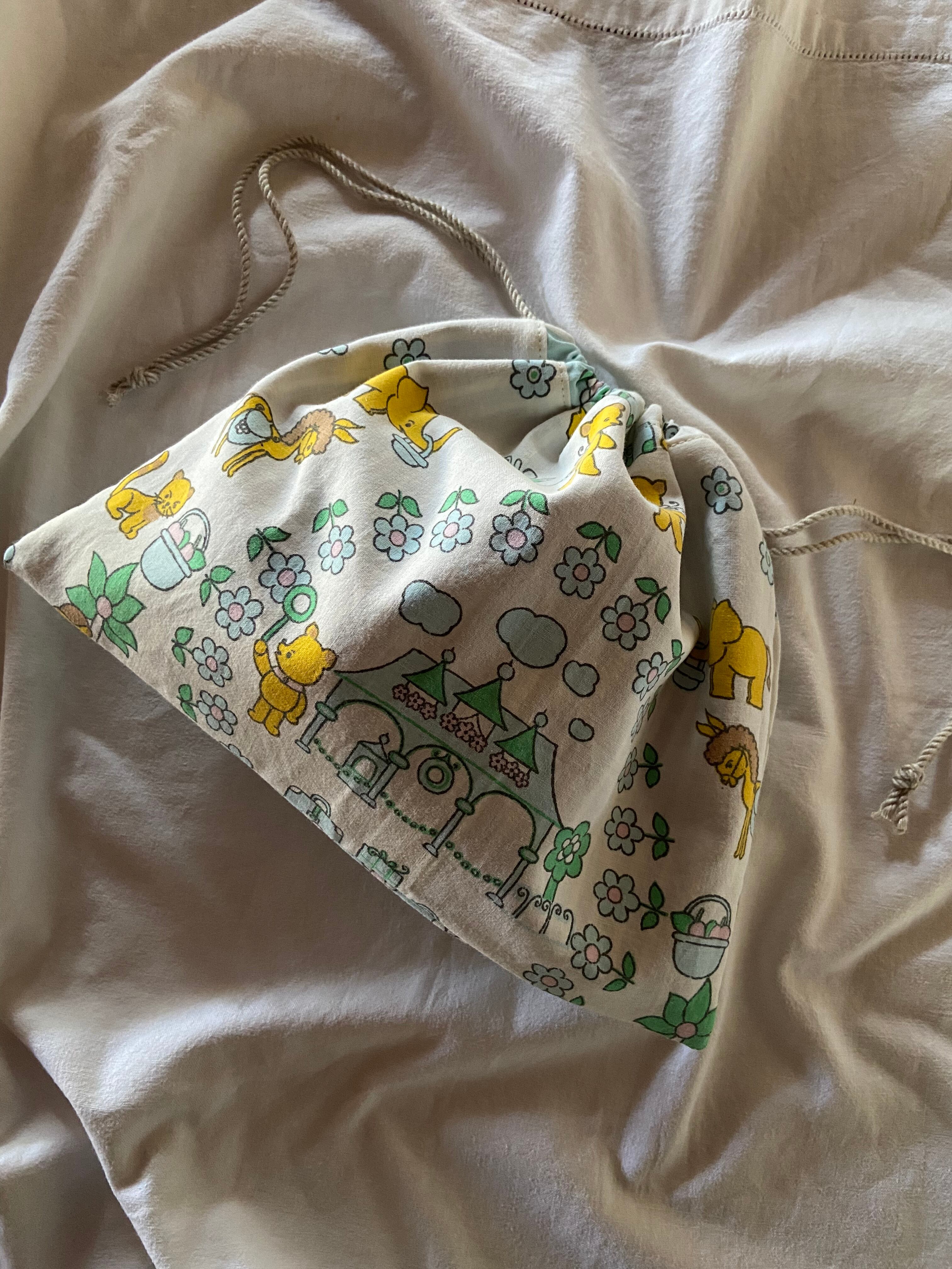 ヴィンテージファブリックで製作した巾着になります。ライオンやぞう、くま、キリンなど人気動物達が遊園地で楽しく遊んでいる様子が描かれている、とっても可愛い生地です♡