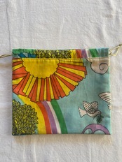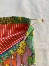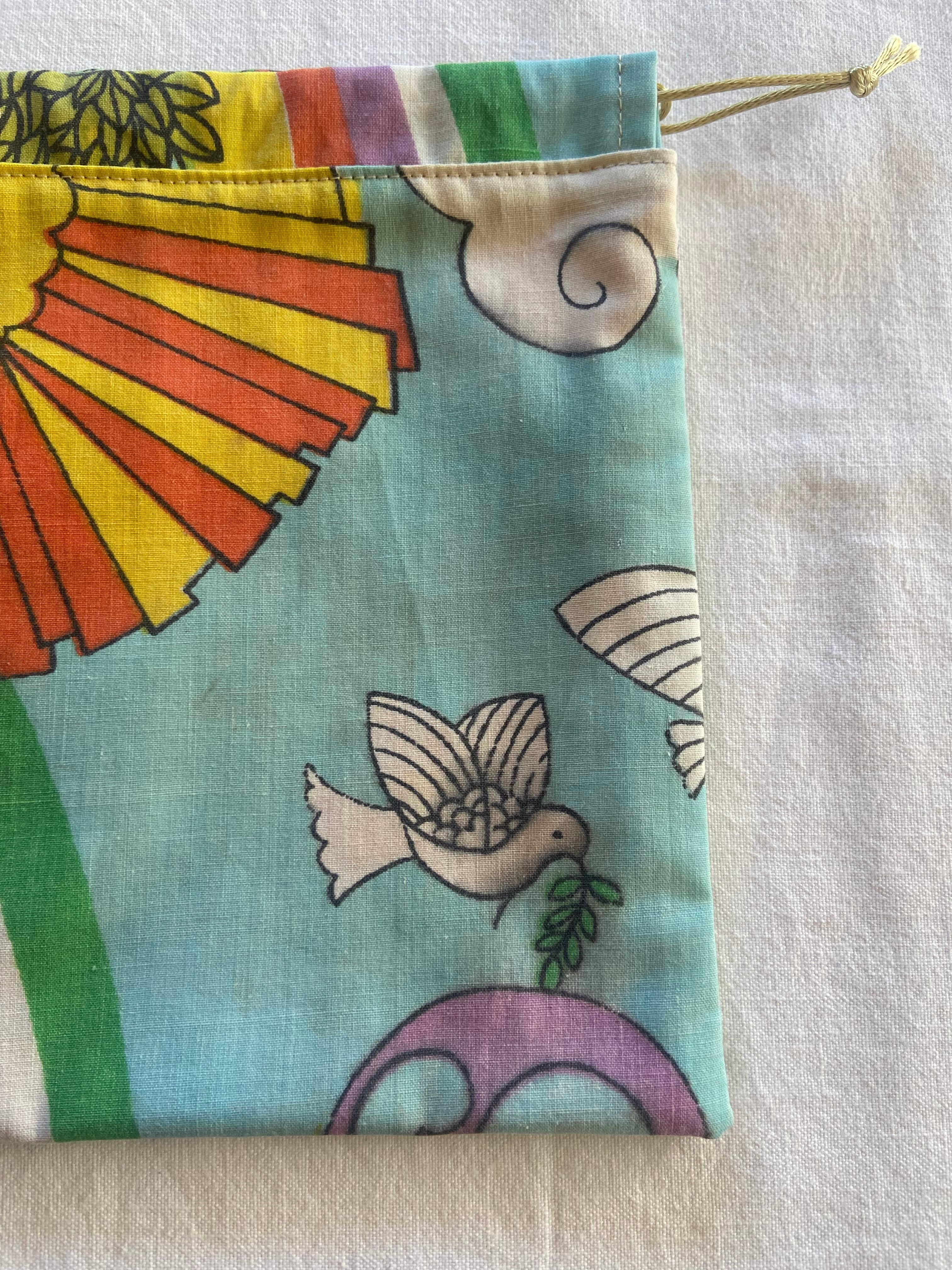 アメリカのビンテージシーツで製作した巾着になります。ノアの方舟に乗り込む動物や魚たちが可愛く描かれております。