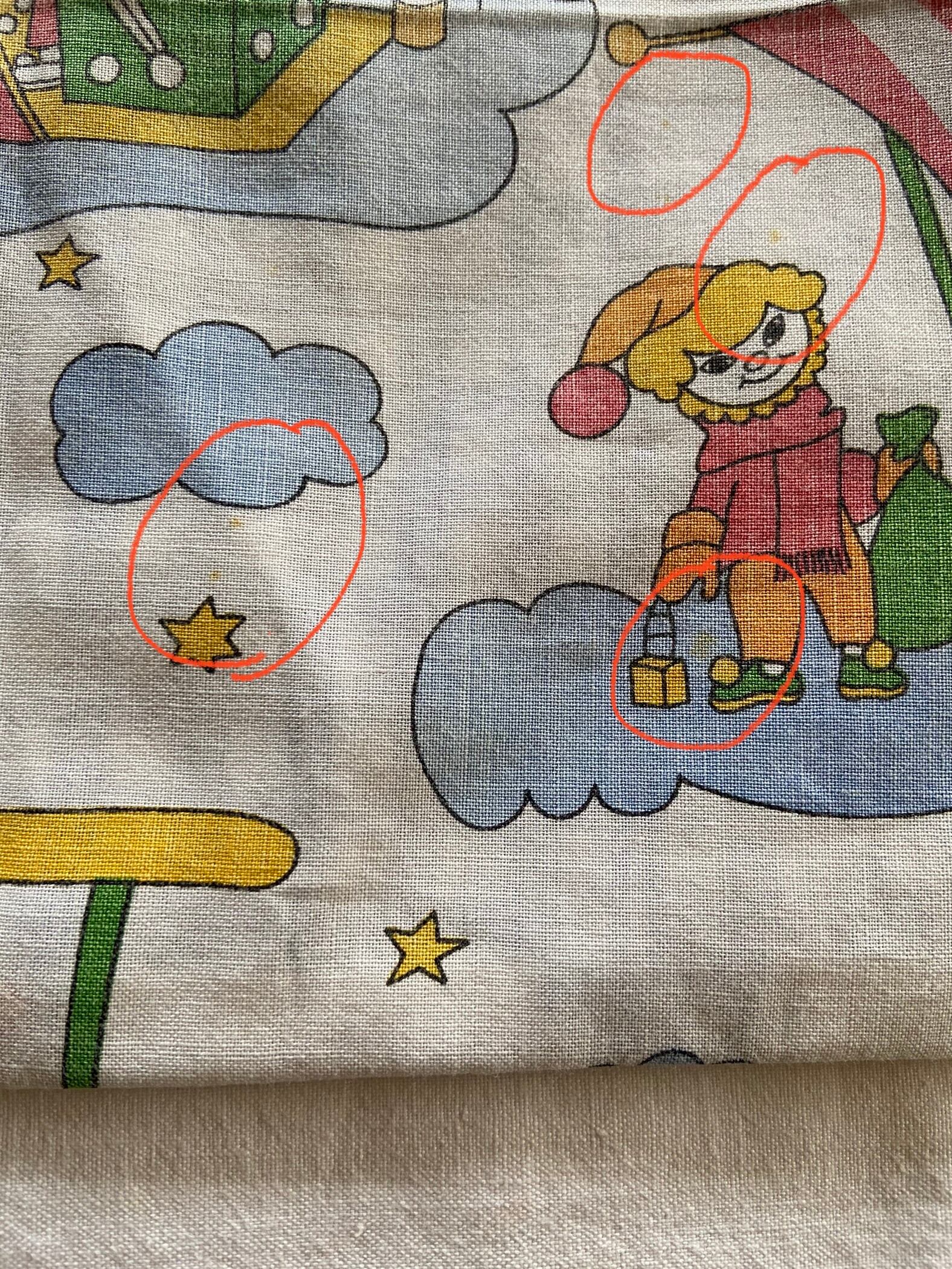 最後にぐるりと一周縫う際、裏側がはみ出てしまいました。飾りで縫っているだけですので、ご使用には全く問題ないかと思います。また、何箇所かシミ?点のようなもの?があります。そこまで目立ちはしないかとは思いますが、写真をご確認ください。そのため少しお値段もお安くしております。
