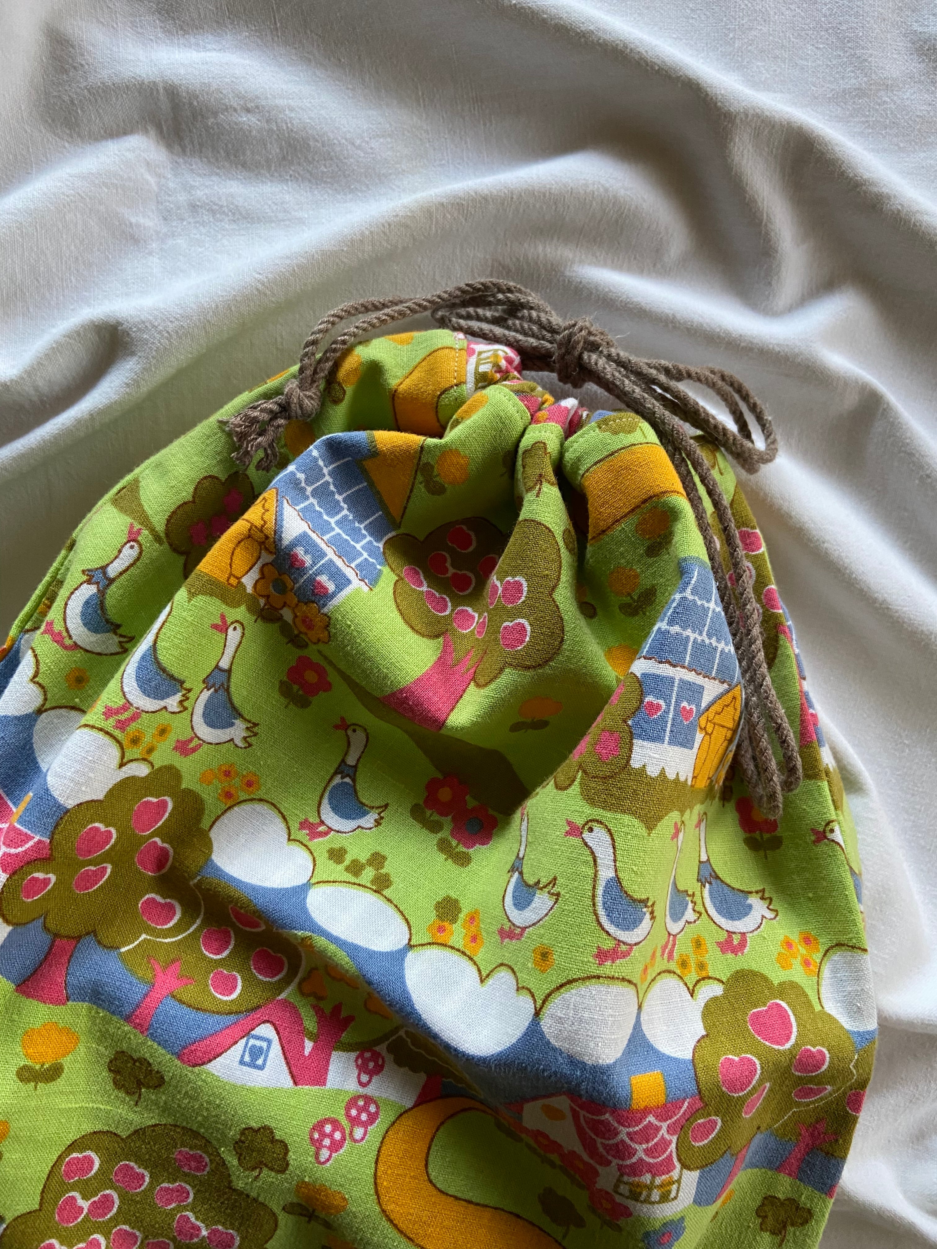 ヴィンテージシーツで製作した巾着袋、大サイズになります。