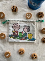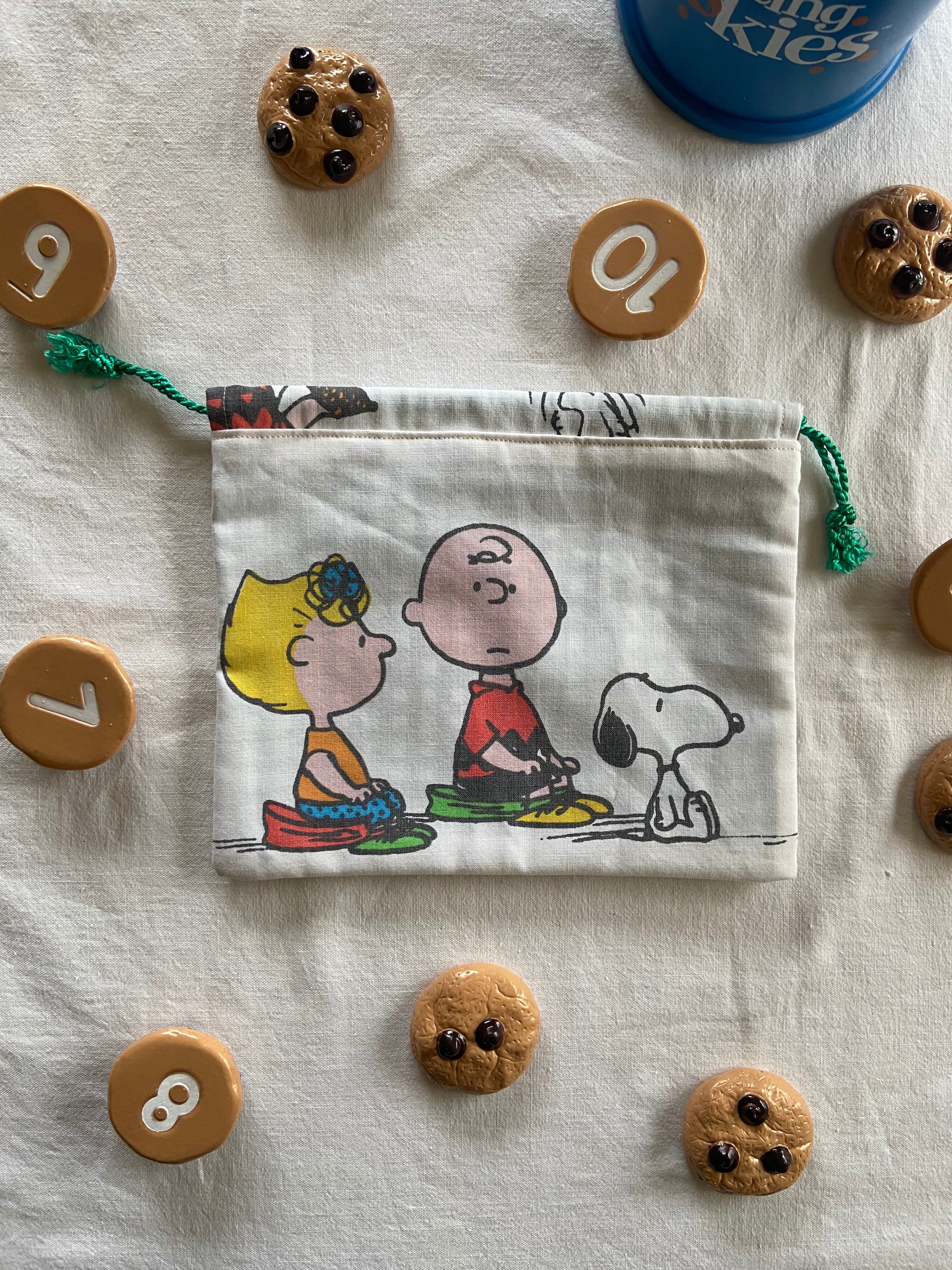 アメリカのビンテージシーツで作成したスヌーピー巾着になります。スヌーピーと仲間たちが楽しそうに遊んでいて、見ているだけでハッピーになれそうです。