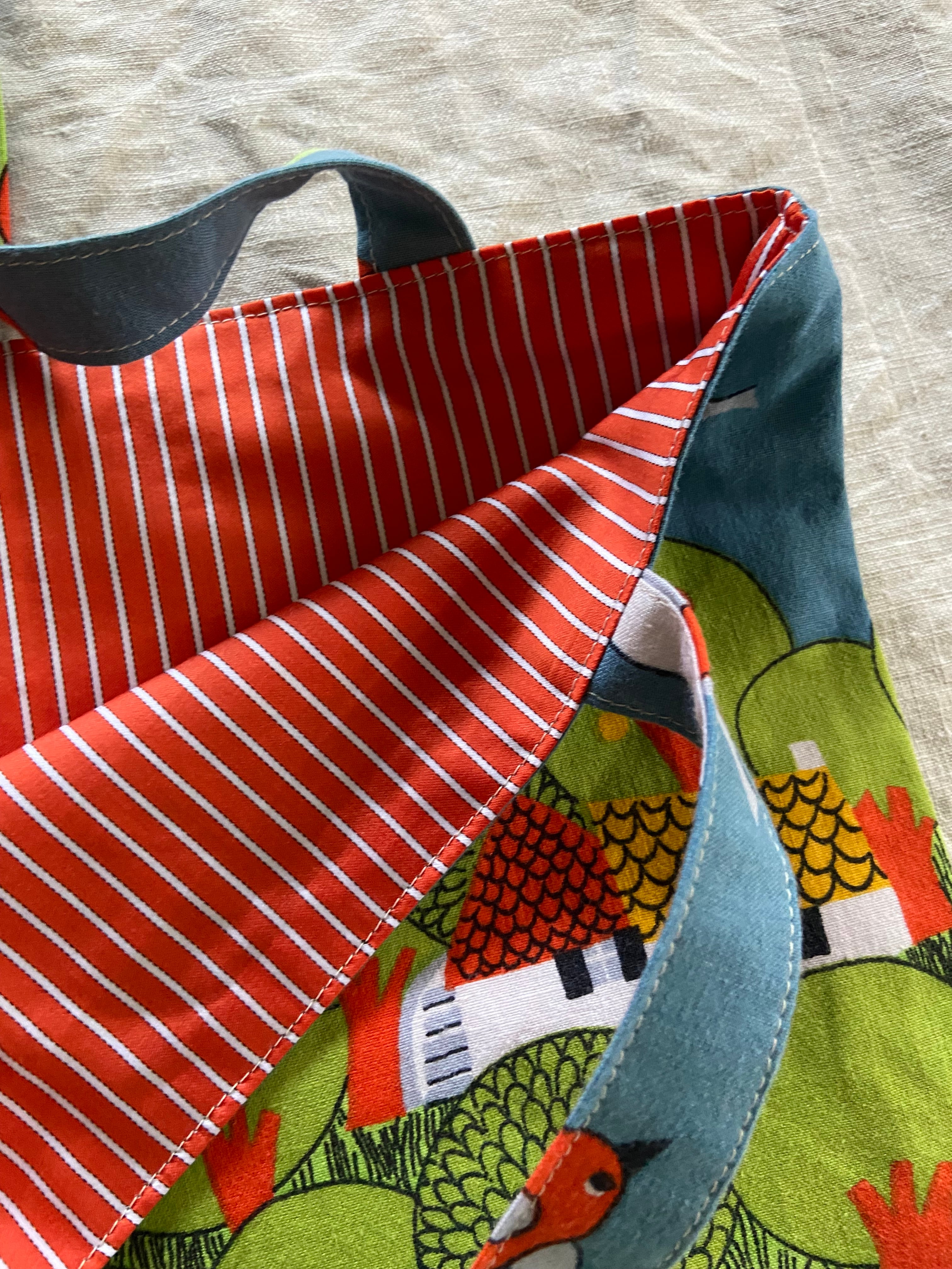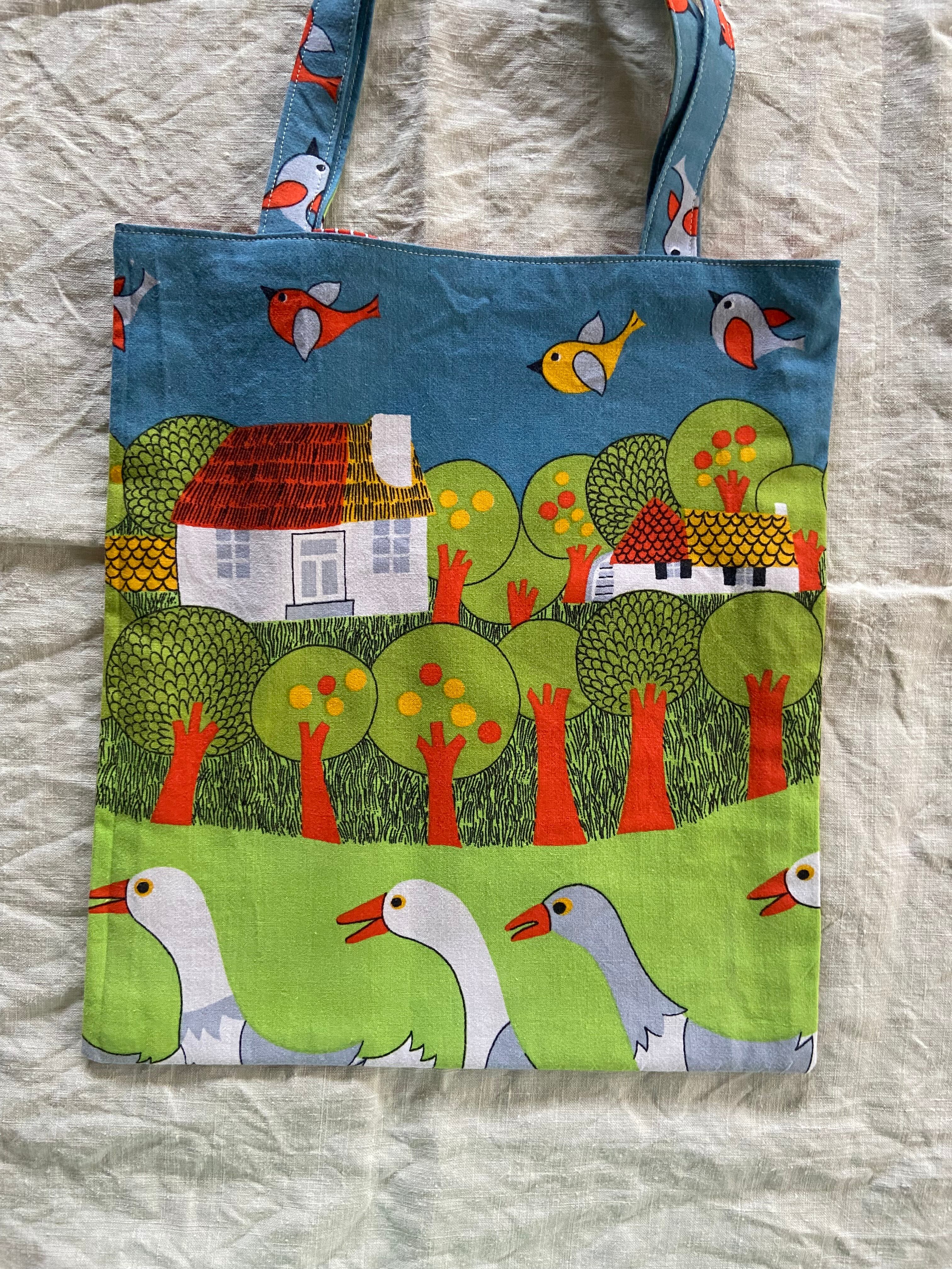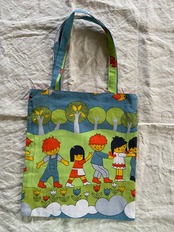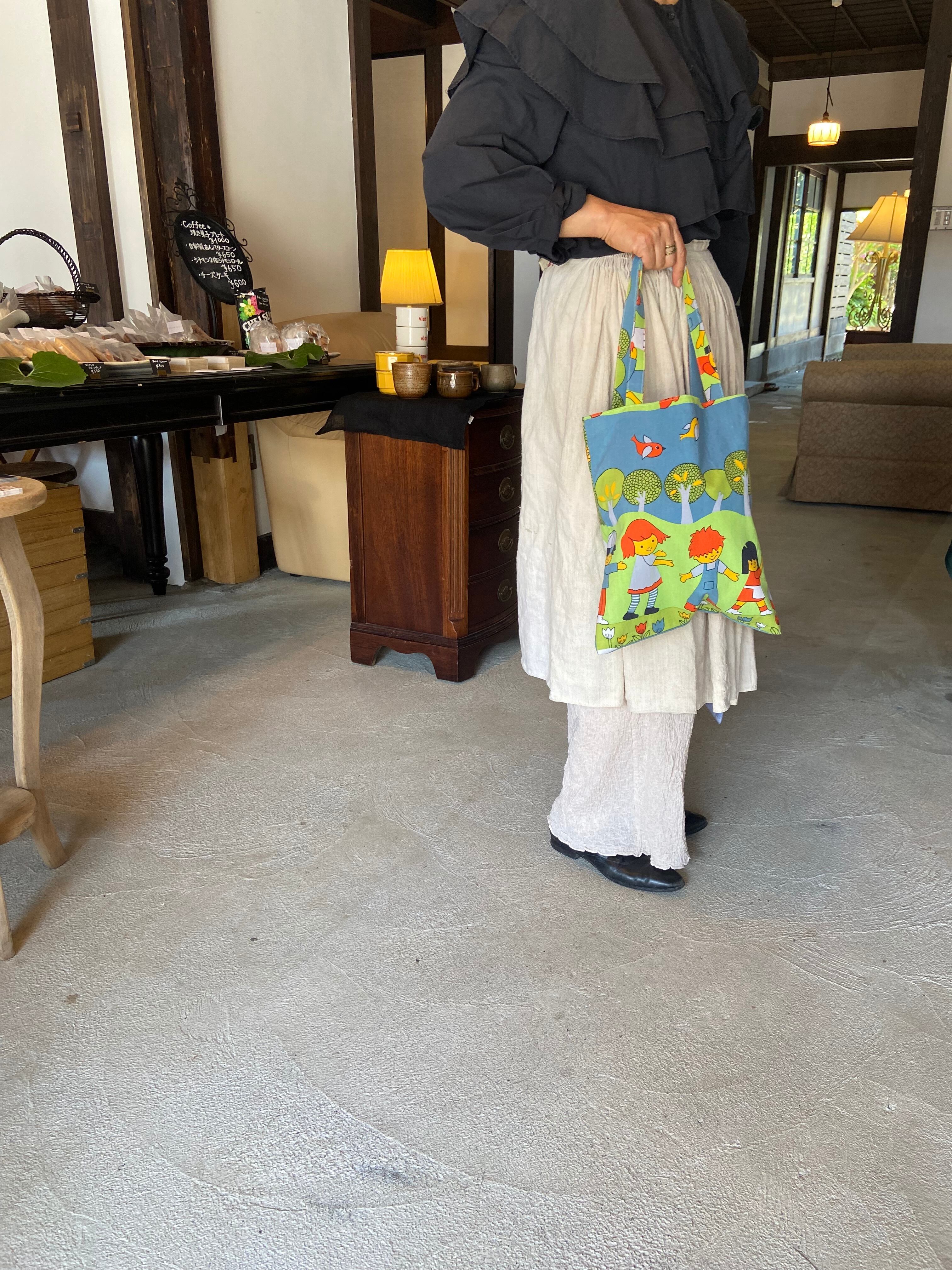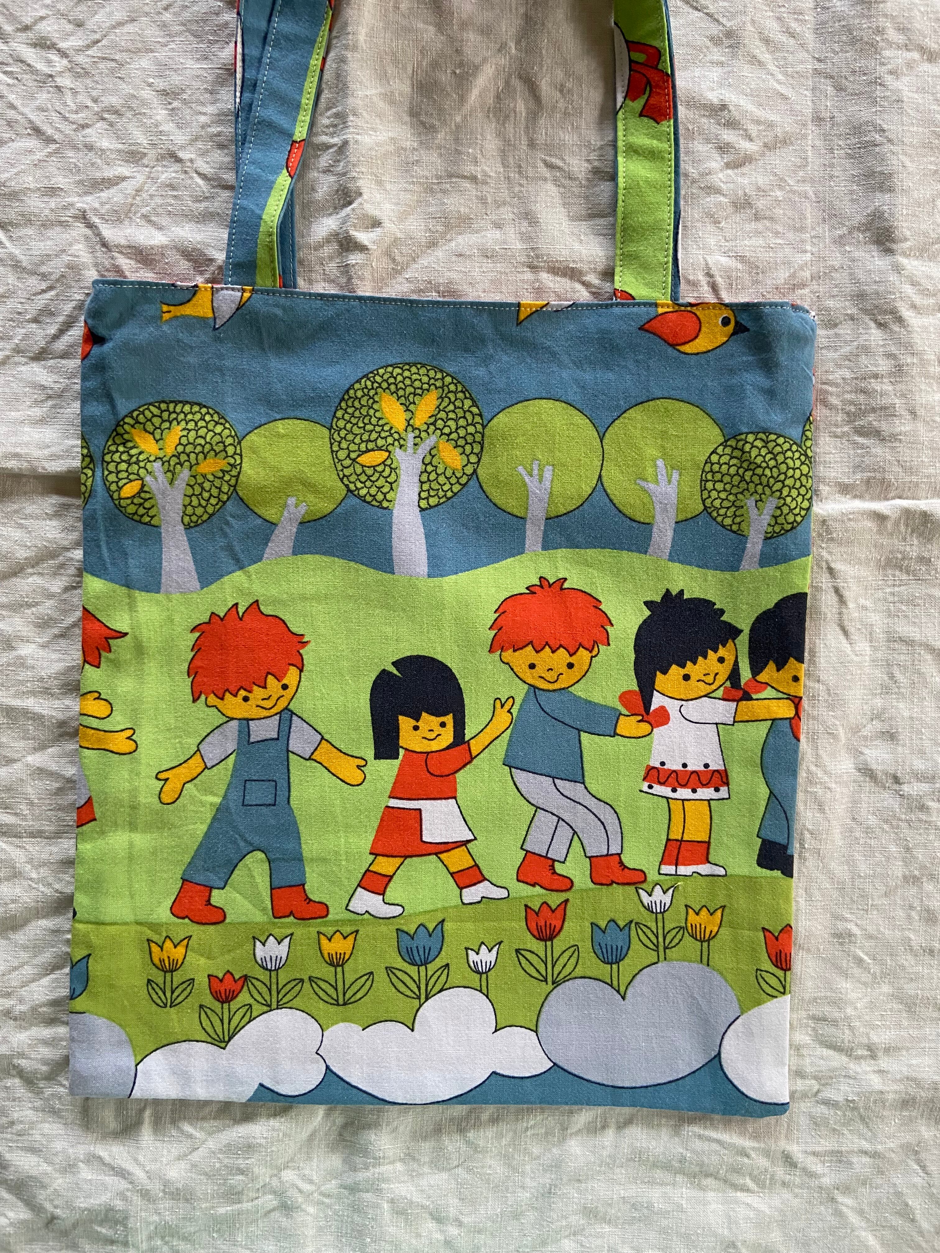 ドイツのビンテージシーツで制作したトートバッグになります。カラフルな色合いで子どもたちや木々、鳥などが描かれており、見ているだけでとってもハッピーになっちゃいます♡