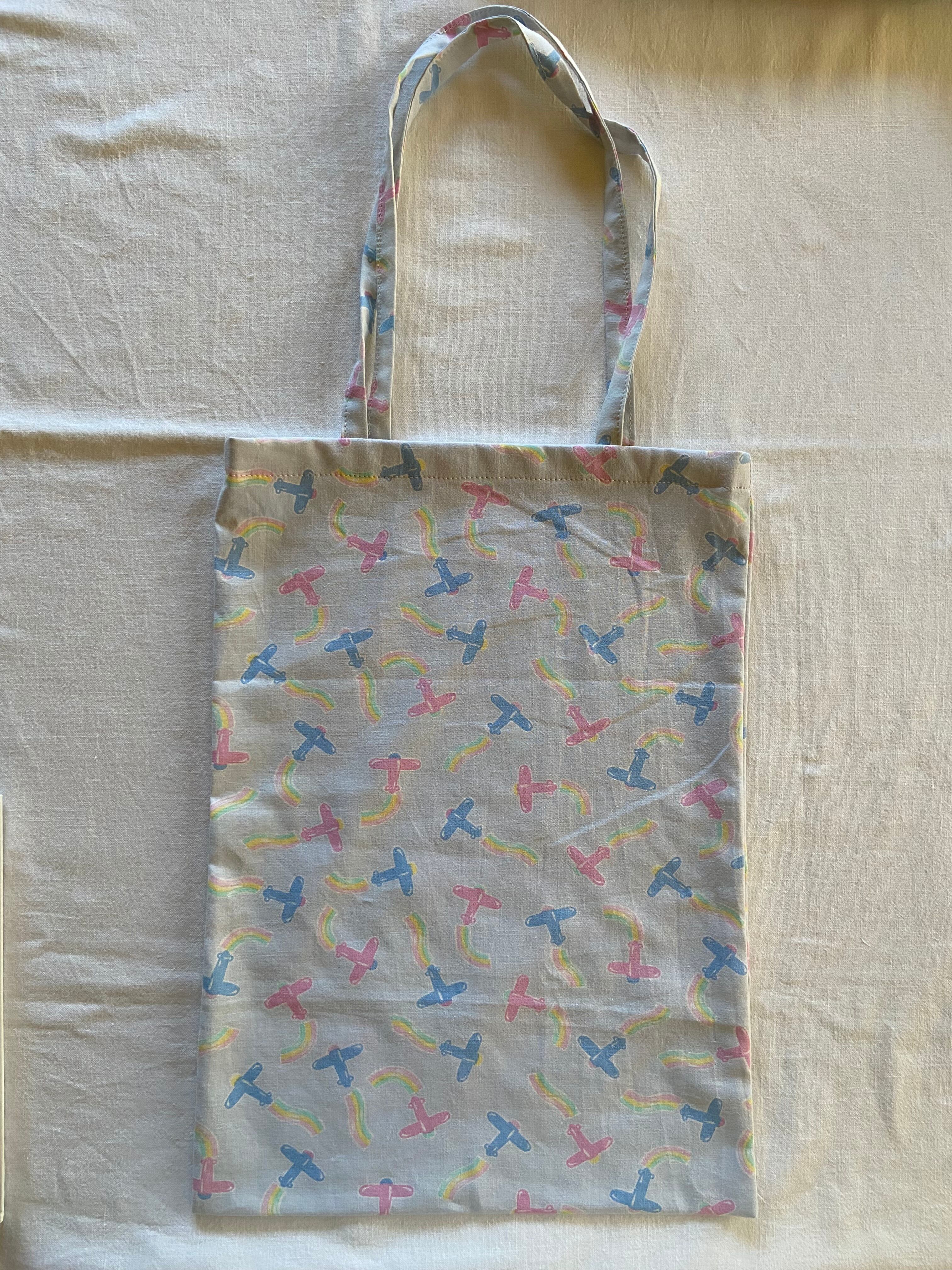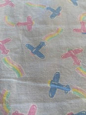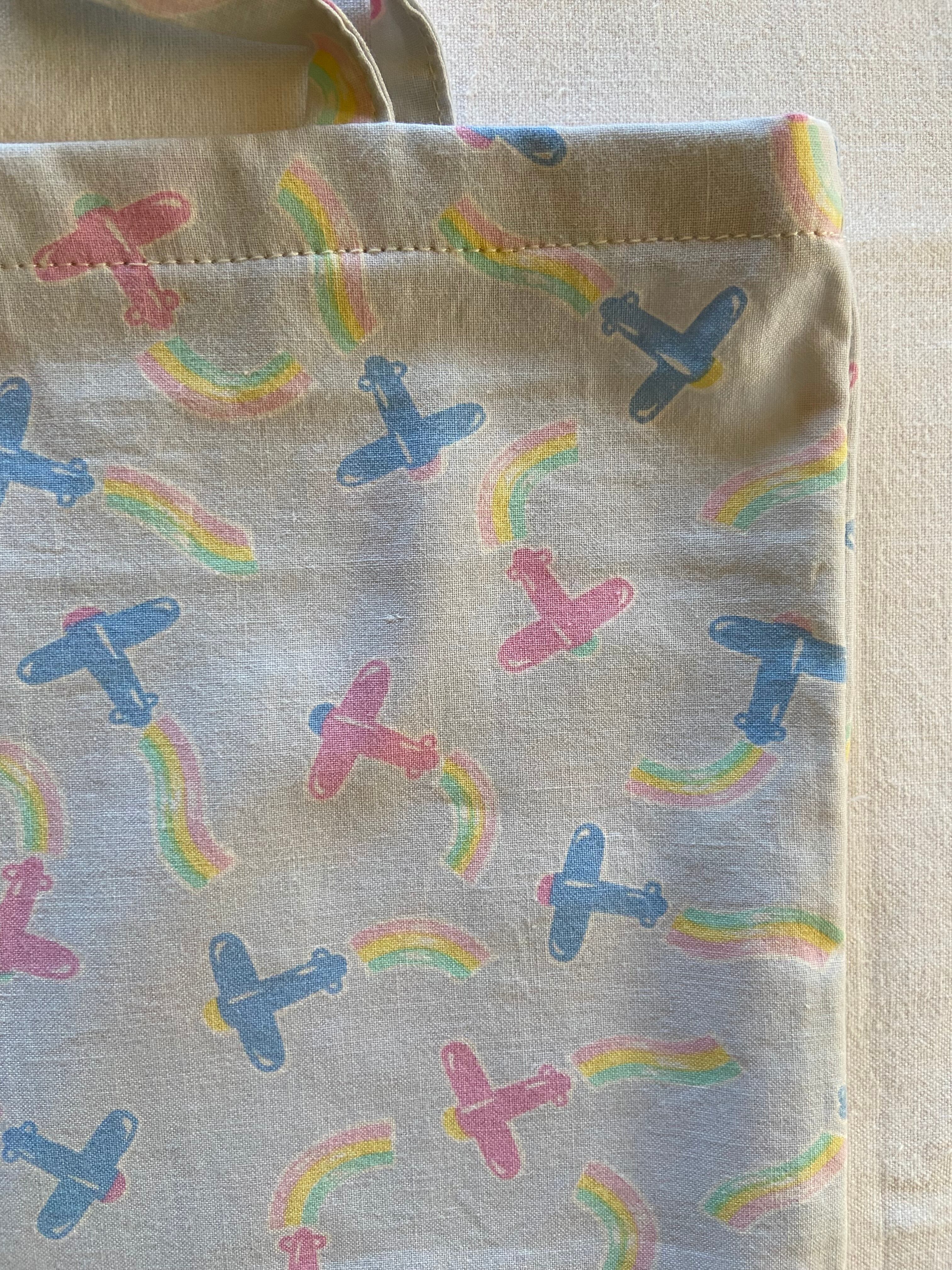 ブーンという元気な音が聞こえてきそうな飛行機のテキスタイル。フランスのビンテージシーツで制作したバッグになります。