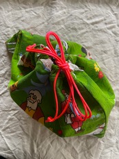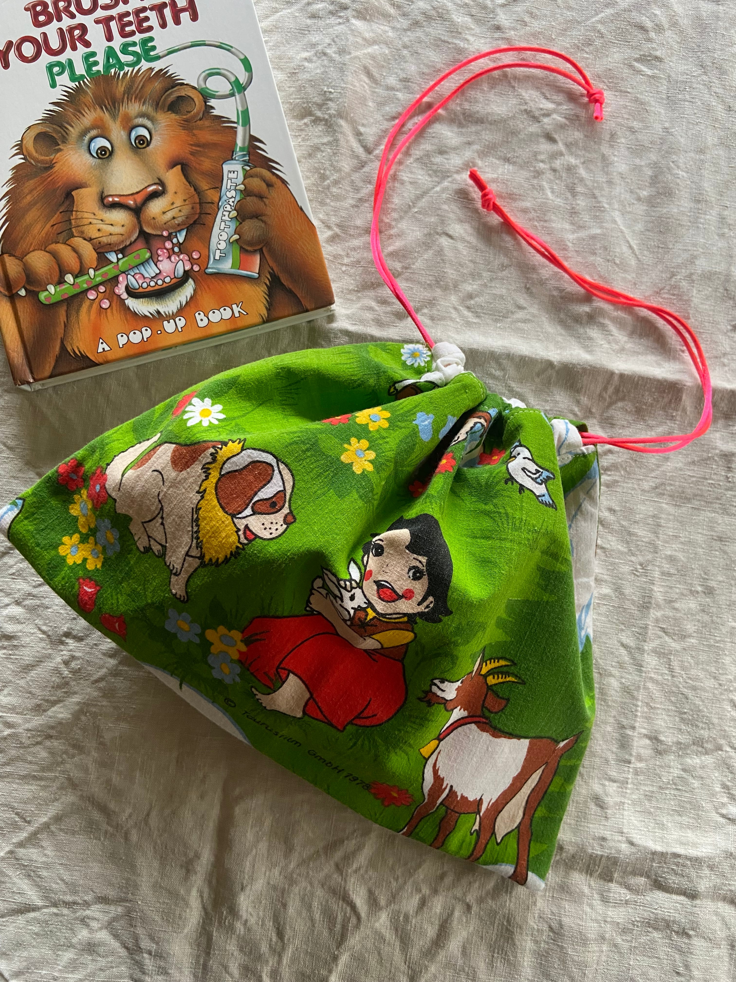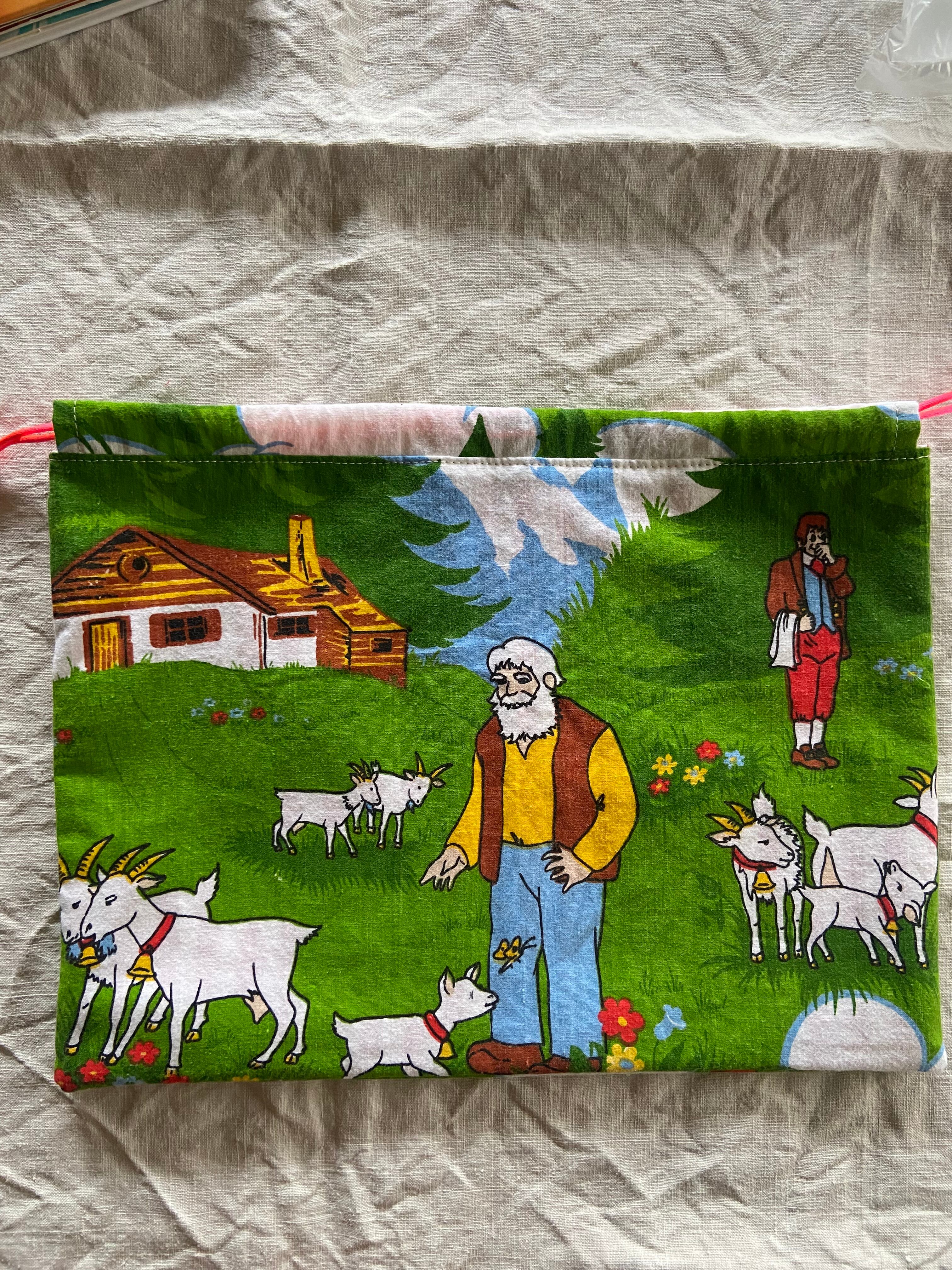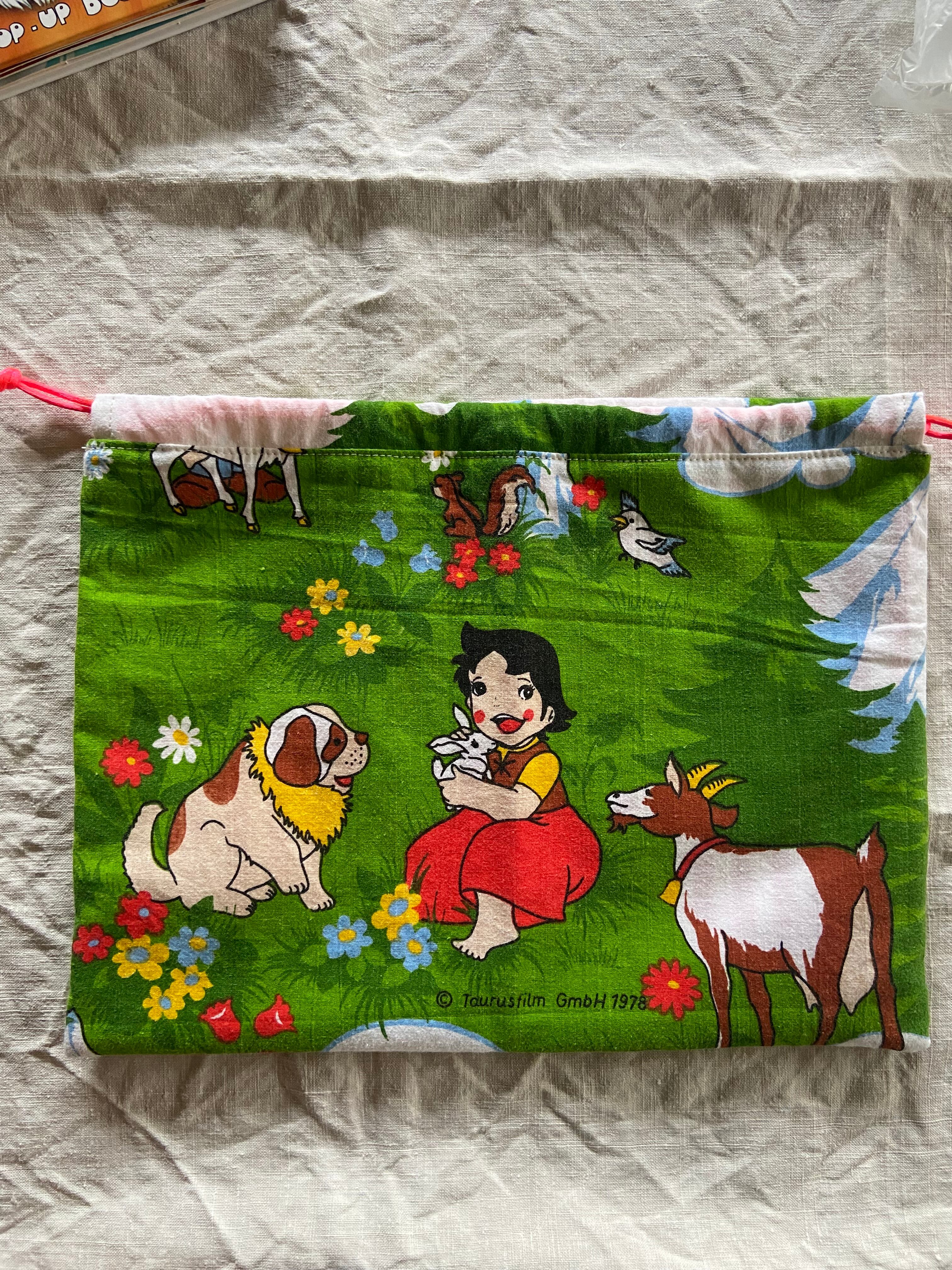 ドイツのヴィンテージファブリックで製作した巾着になります。ハイジやおじいさん、動物たちがアルプスの大自然の中で暮らしている様子を近くで感じることができます。鮮やかな色合いも良い!