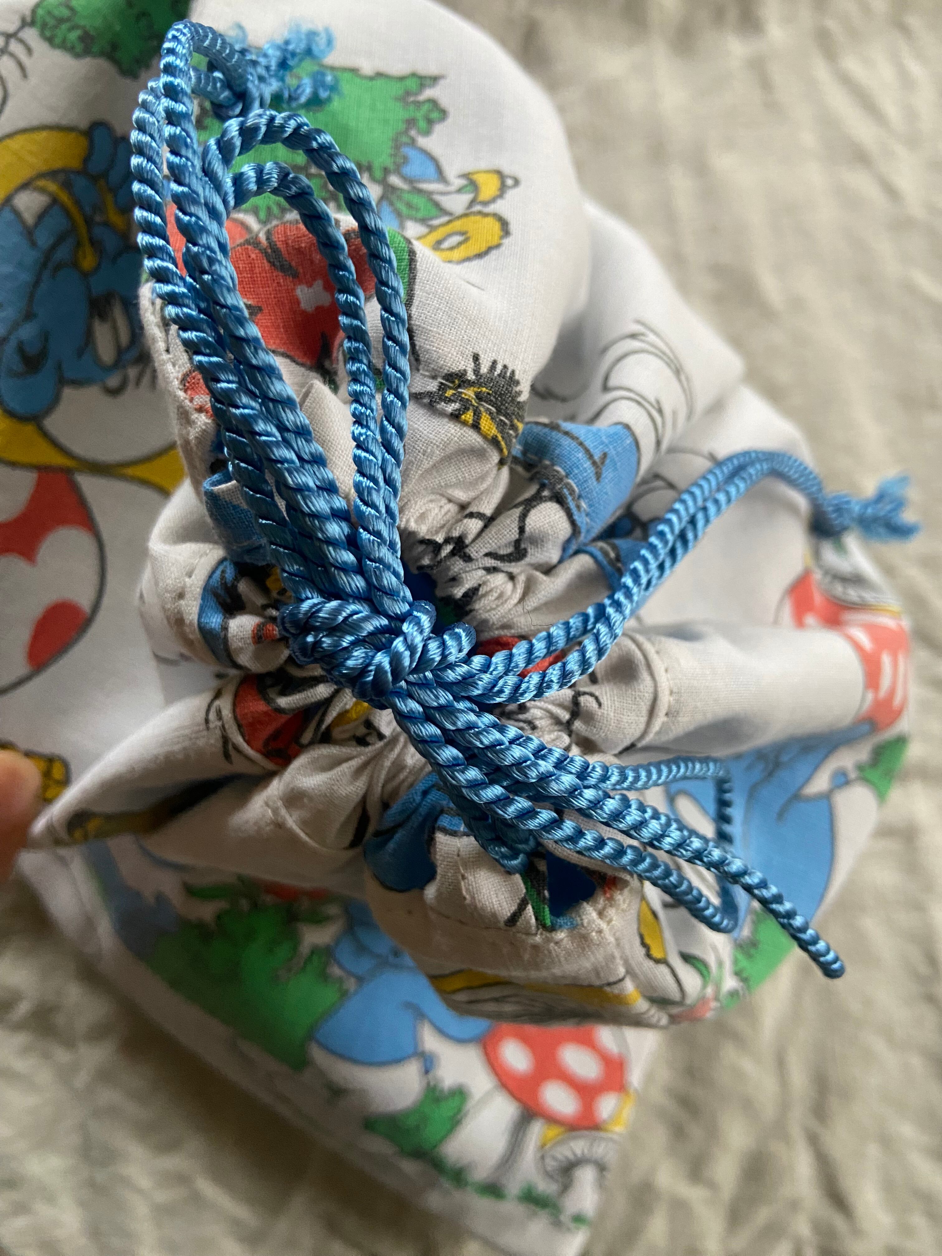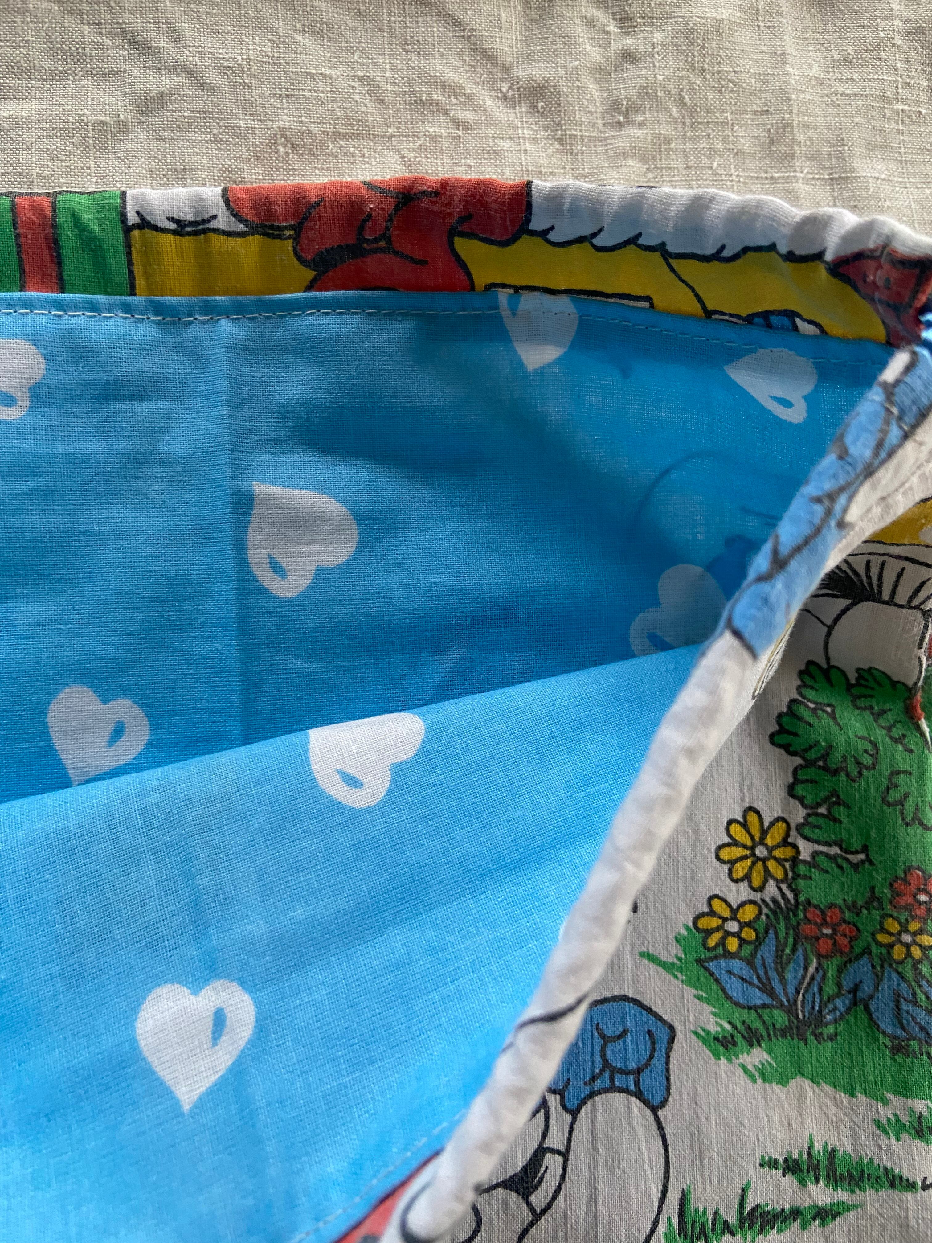 ハートがたくさんの水色の内布もフランスからのヴィンテージファブリックです。巾着を開けた時にチラリと見えるのがかわいいです。