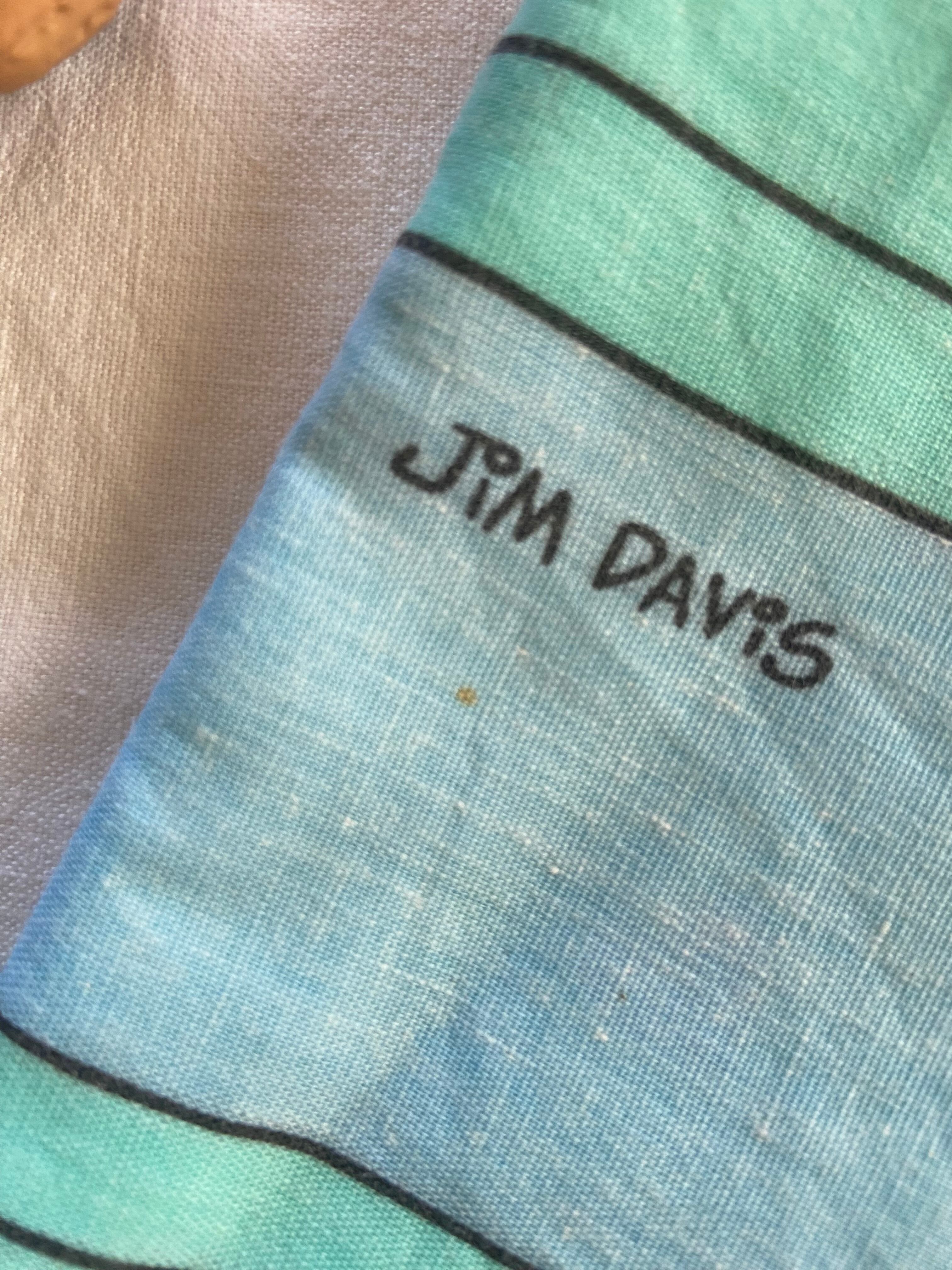 犬のサイドのJim Davisの下に小さなオレンジ色のポチがあります。何かのシミか、ガーフィールドのインクが飛んだものか分かりませんが、少し値段に反映させております。
