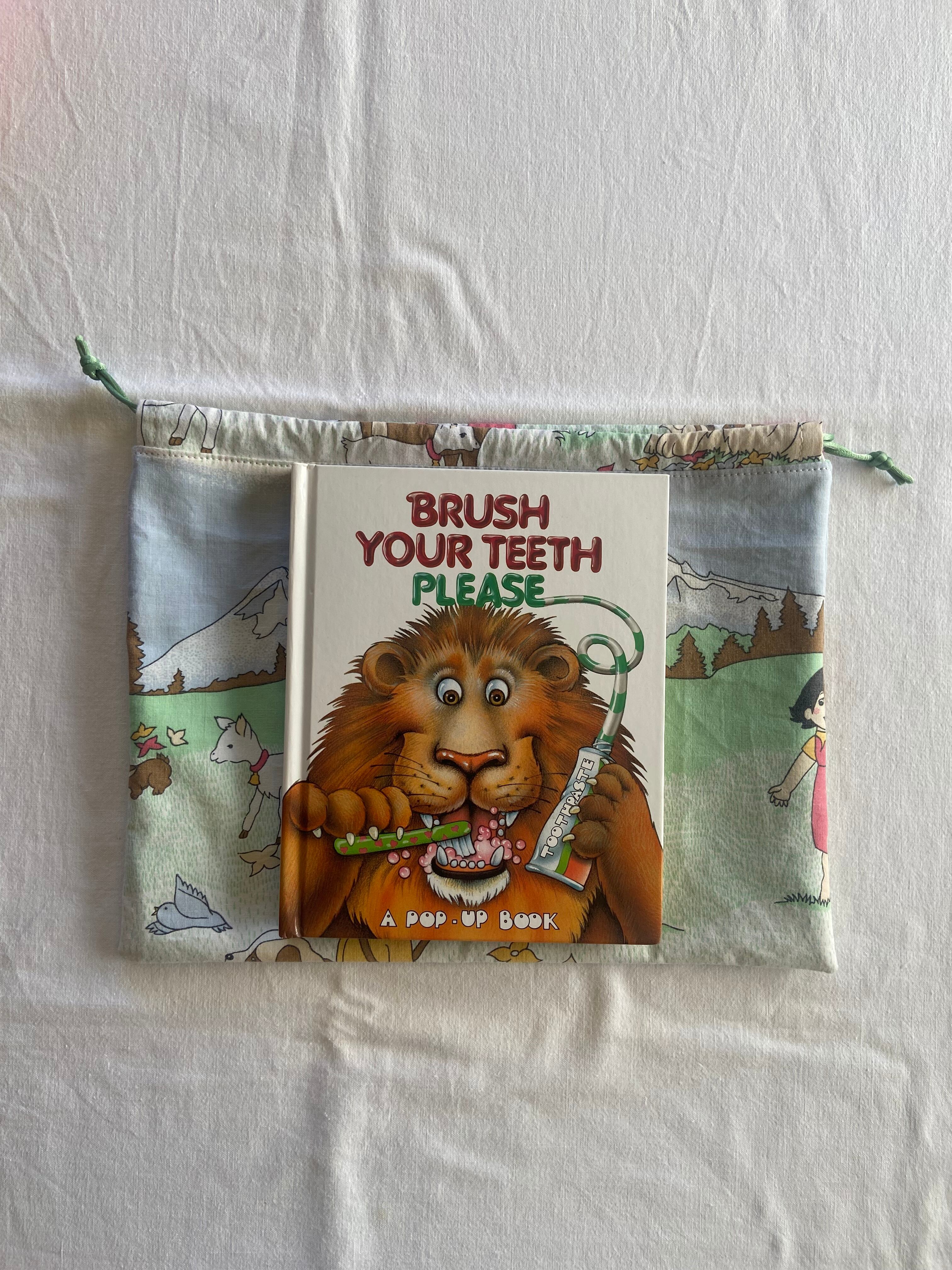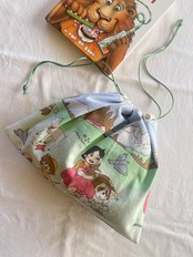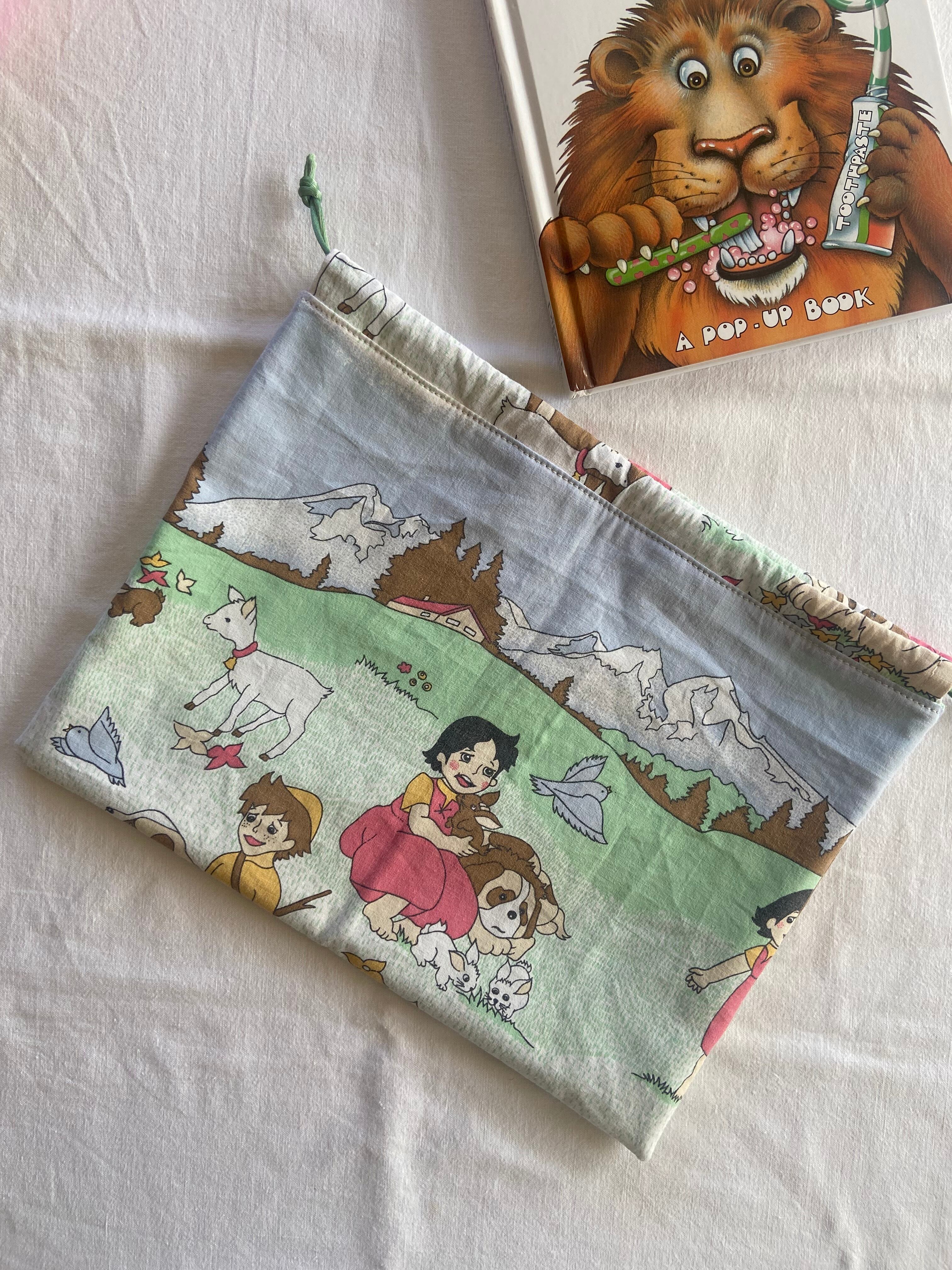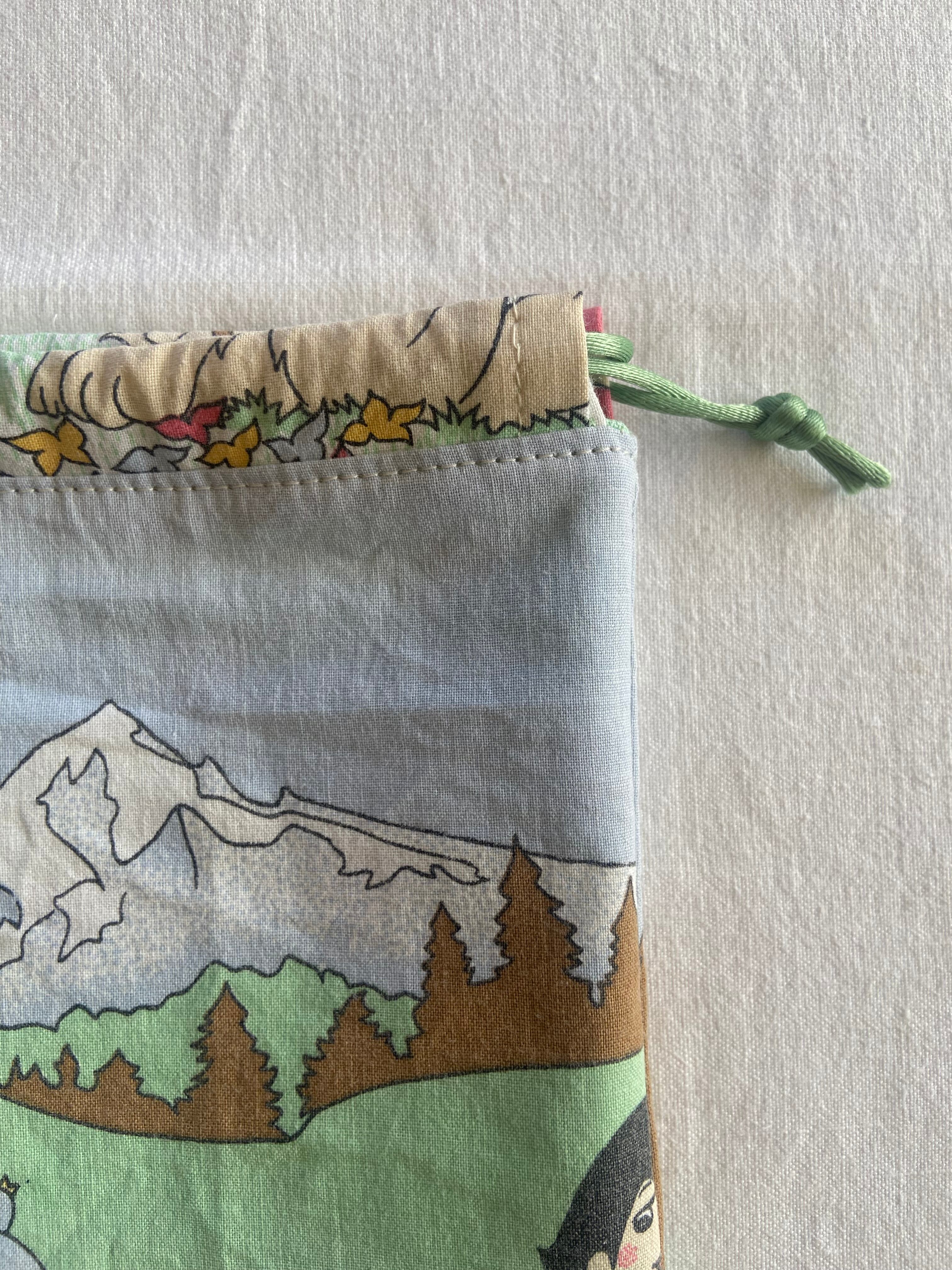 フランスのヴィンテージファブリックで製作した巾着になります。アルプスの大自然の中で生活するハイジや動物たちが可愛く描かれています♡